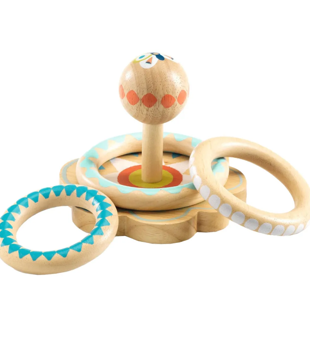 Djeco stablelegetøjet består af en rundt base med en pind der har en bold på toppen. På pinden kan man stable de runde cirkler.