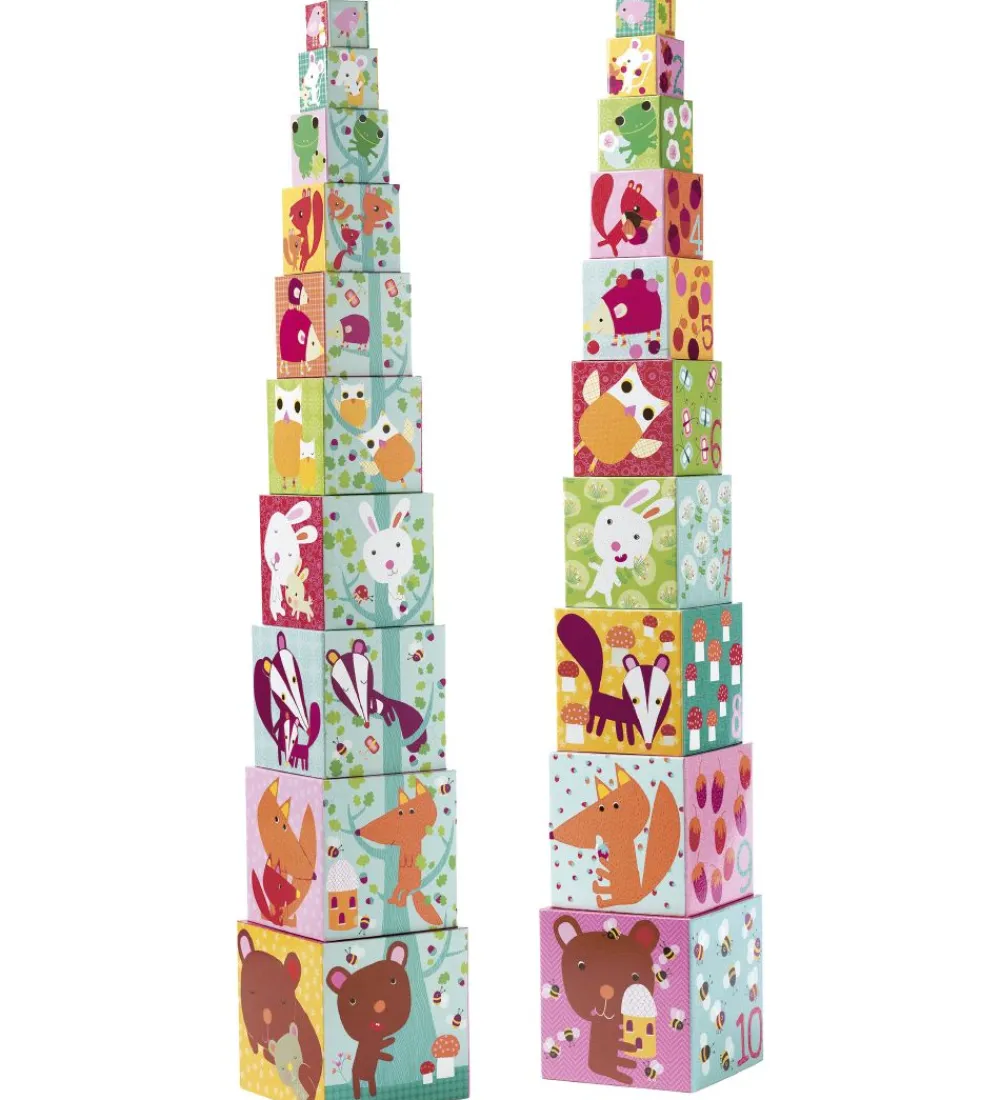 Djeco spillet går ud på at få stablet kasserne ovenpå hinanden efter størrelse. Undervejs kan man tale om de mange forskellige tal og dyr der er på kasserne. Indeholder 10 kasser.