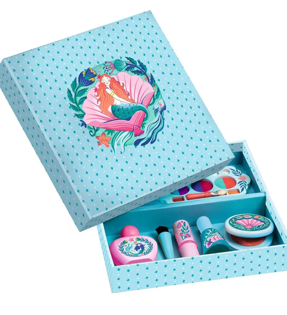 Smukt Djeco makeup i træ i lavendel og blå med skønne prints af havfruer og blomster.