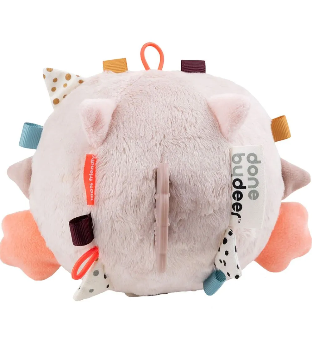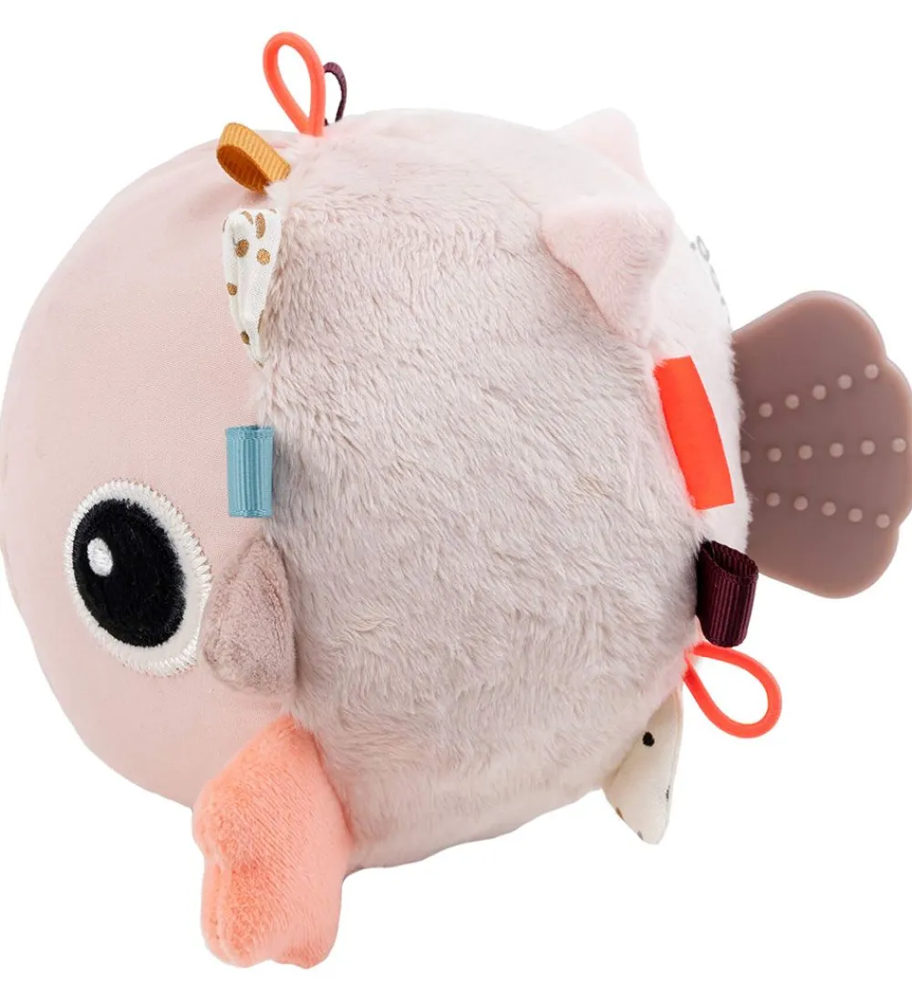 Smart Done By Deer aktivitetsbold i rosa, med masser af detaljer, der stimulerer babys sanser i forskellige farver, med form som fisken “Puffee”.