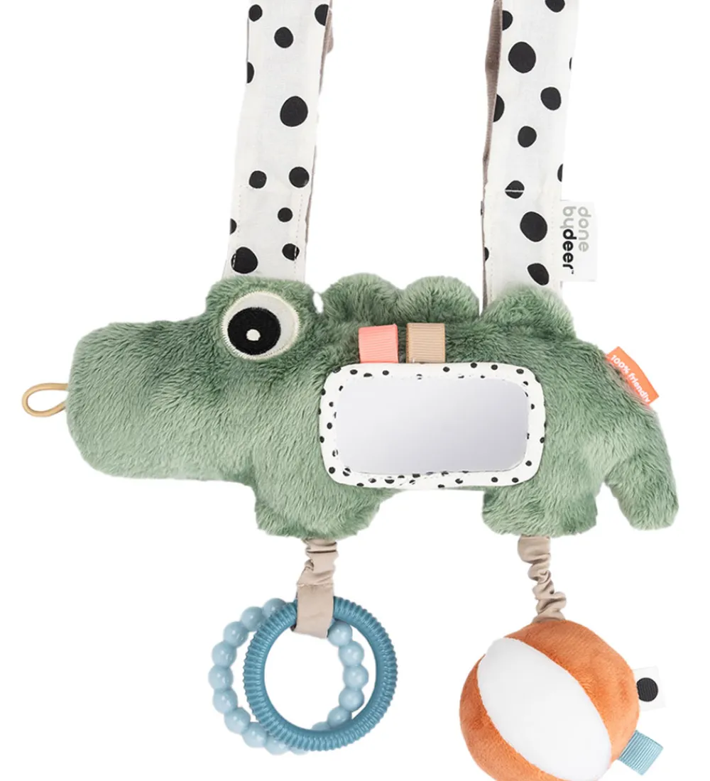 Lækkert aktivitetslegetøj fra Done by Deer i form af en plysset, grøn krokodille med spejl, bideringe og en stofbold med klokke.