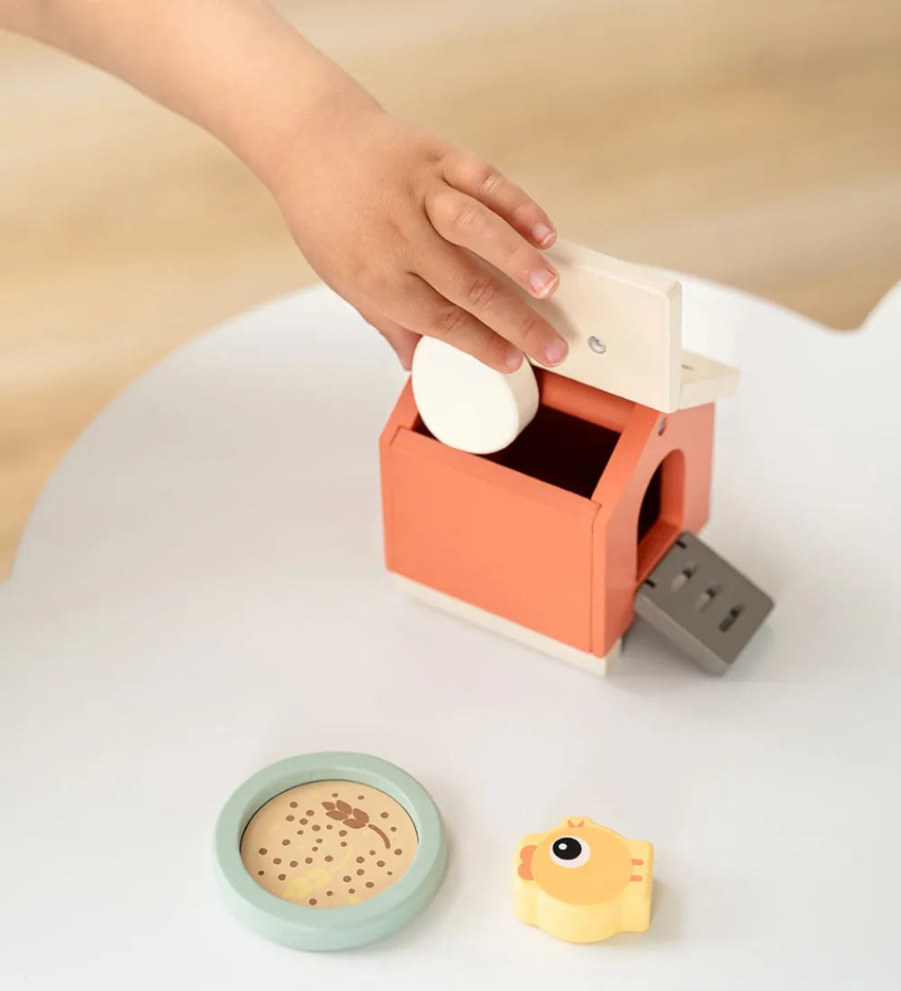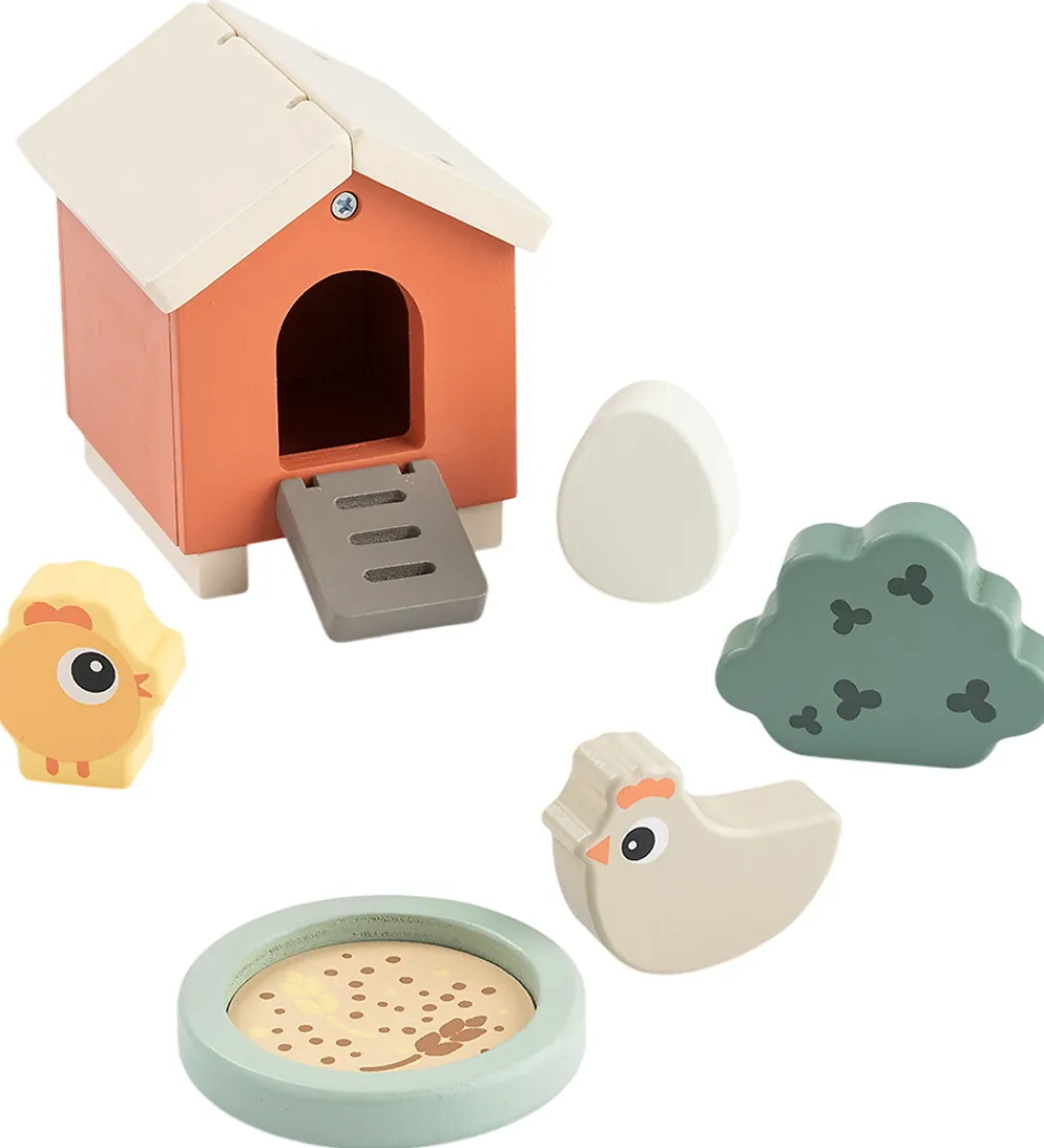 Hyggeligt Done by Deer legetøj bestående af et hønsehus med en høne, en kylling, et æg, mad og en busk. Hønsehuset har en smart trappe og et tag, som kan vippes op. Legetøjet er malet i fine farver og indbyder til kreative lege.