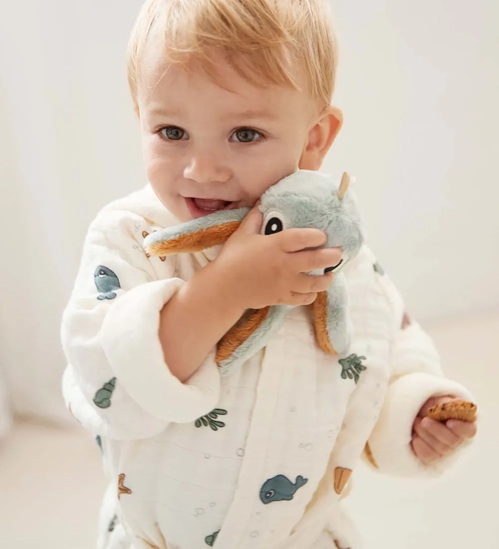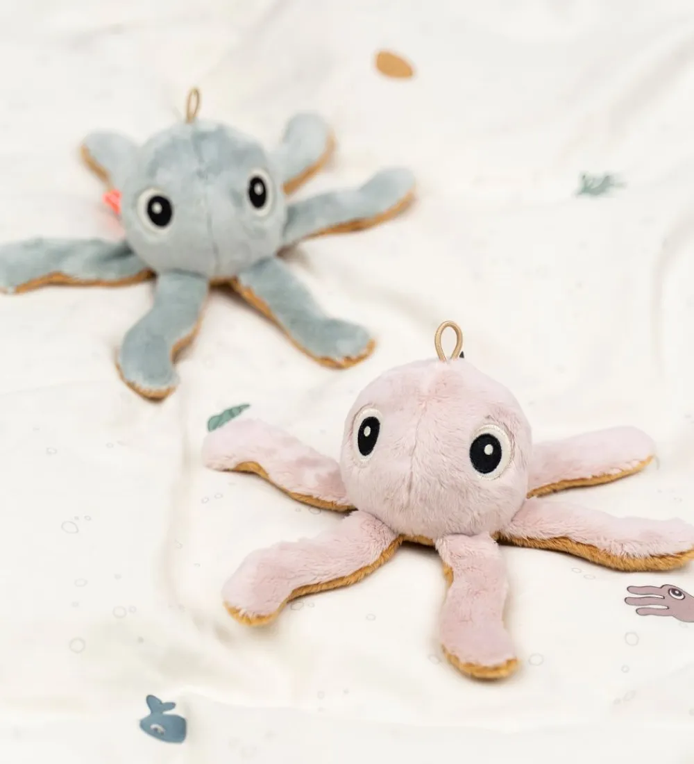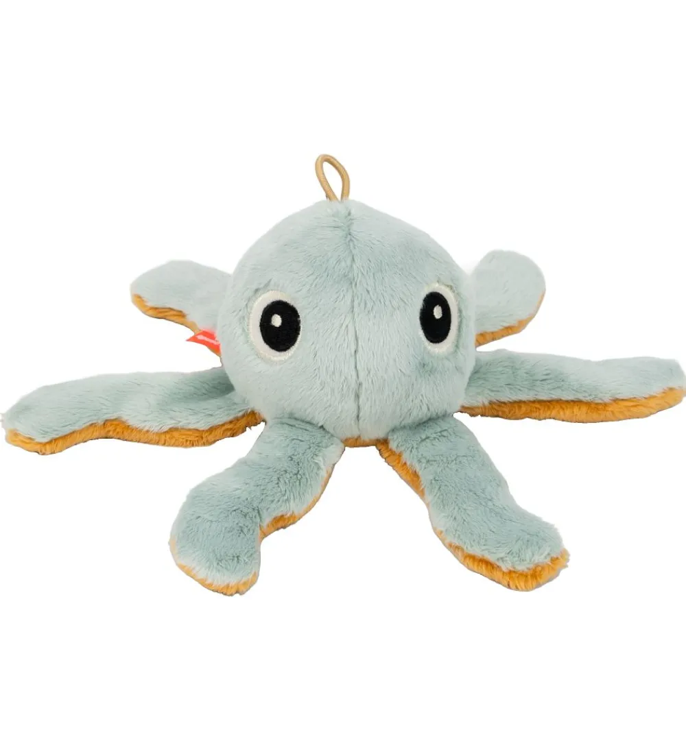 Done by Deer ranglen har en fin lille hank på hovedet, så den kan hænges op. Ranglen er lækker og blød at holde om, og når man ryster den, ringer klokken, som gemmer sig indvendigt. Blækspruttens arme siger også en spændende, knitrende lyd, når man tager fat om dem.