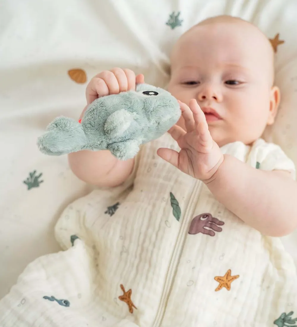 Fin Done by Deer rangle formet som en blød, lys blå hval med fine store øjne. Hvalen hedder Wally, er vil gerne være dit barns nye bedste ven.
