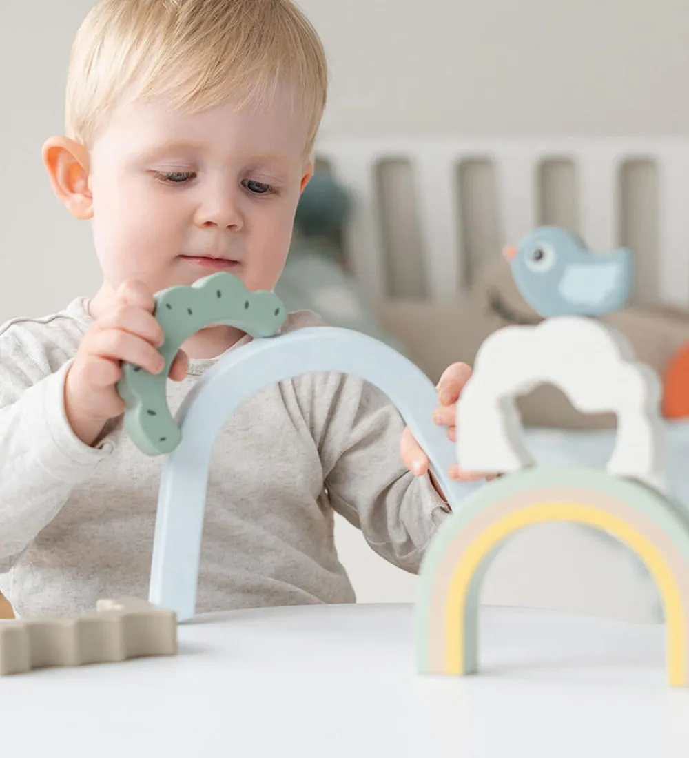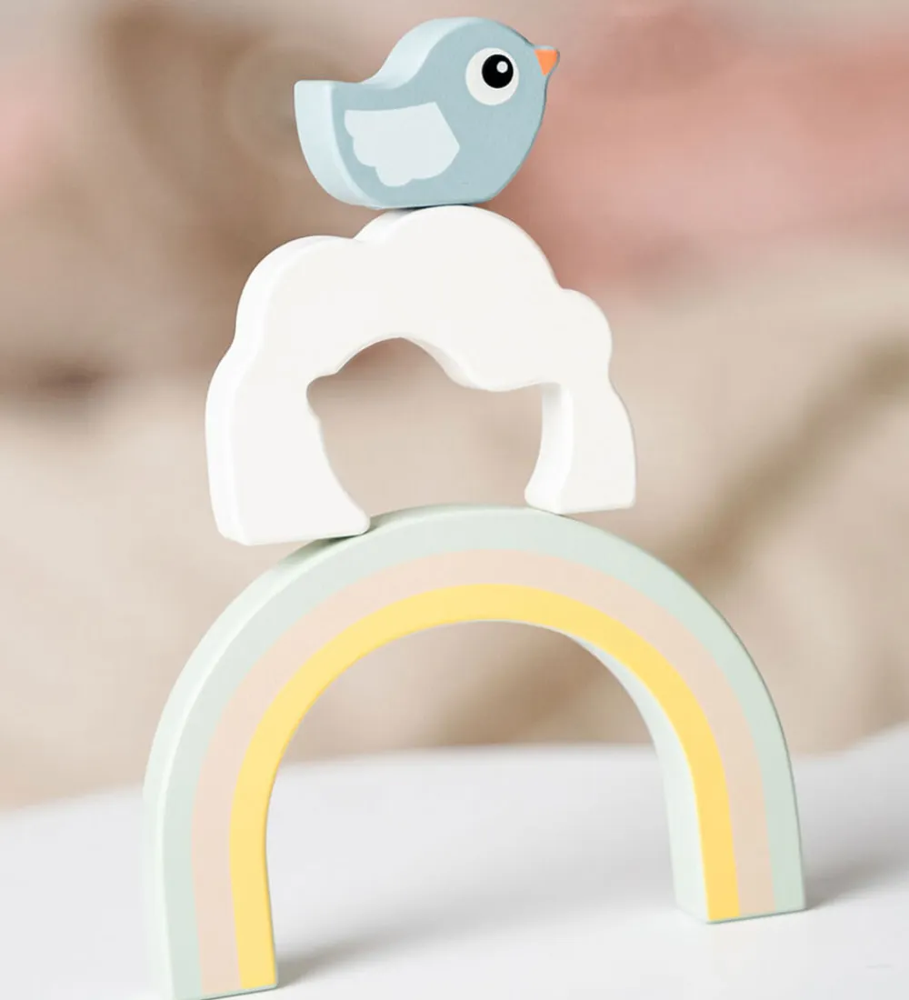 Sjovt Done by Deer stablelegetøj med tre klodser i naturligt træ med forskellige former og farver. Den inderste klods er formet som Birdee fuglen, den midterste klods er en hvid sky, og den yderste klods er en fin regnbue i blå, rosa og gul.