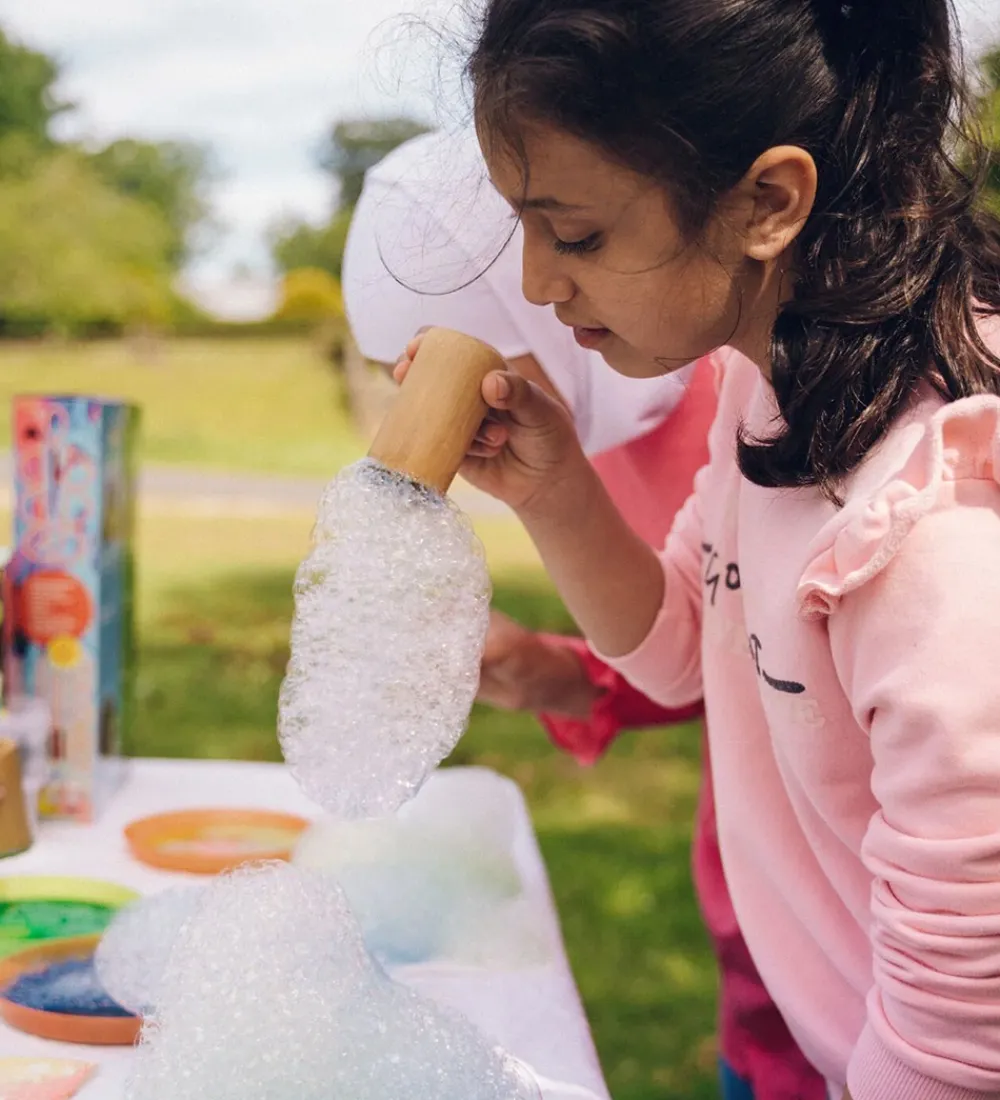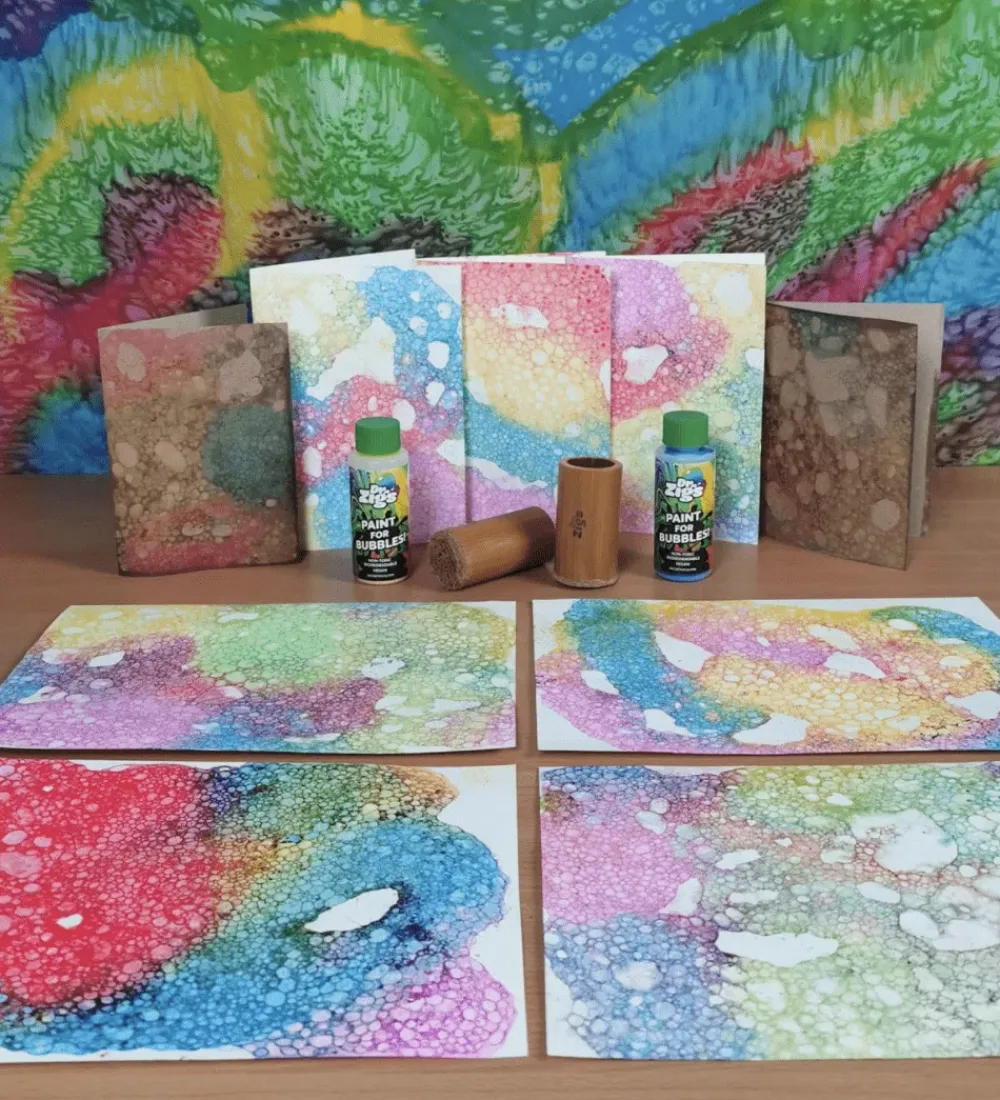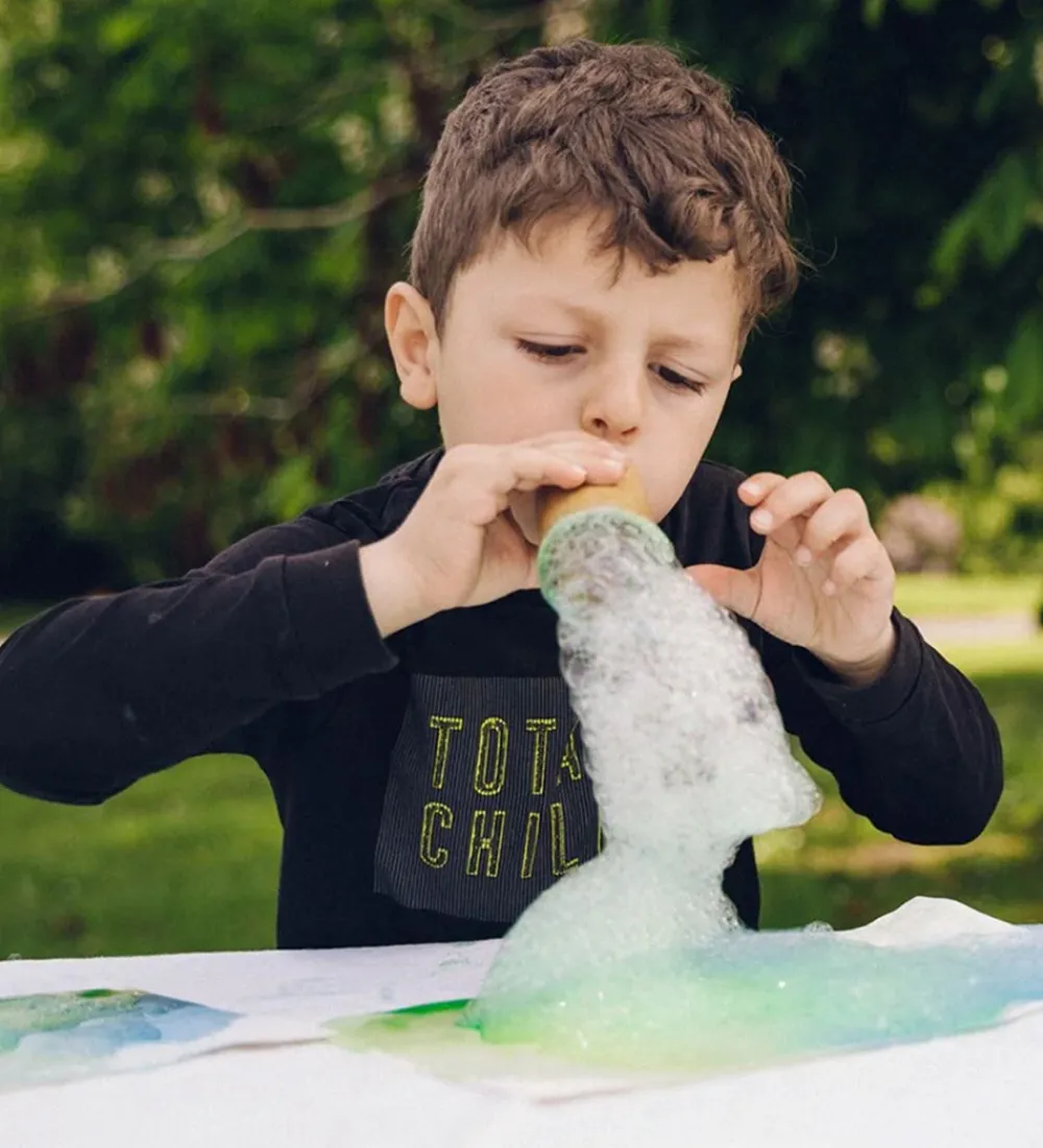 Dr Zigs farveskummeren kan f.eks. bruge til farvet sæbeboble sæbe for at lave kunst på et lærred.