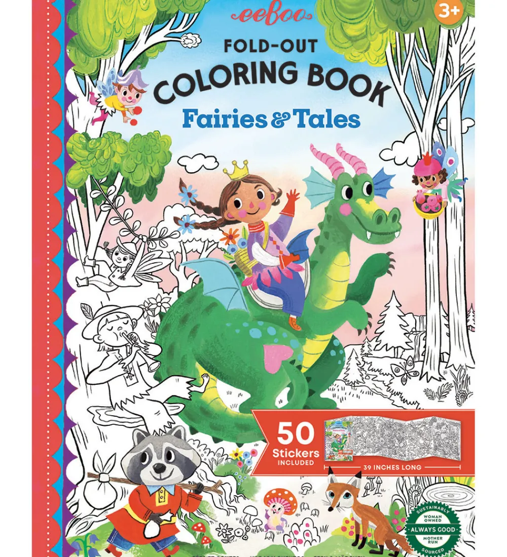 Fin Eeboo fold ud malebog med motiver af feer og eventyr. Der medfølger 50 klistermærker, som der også kan dekoreres med.
