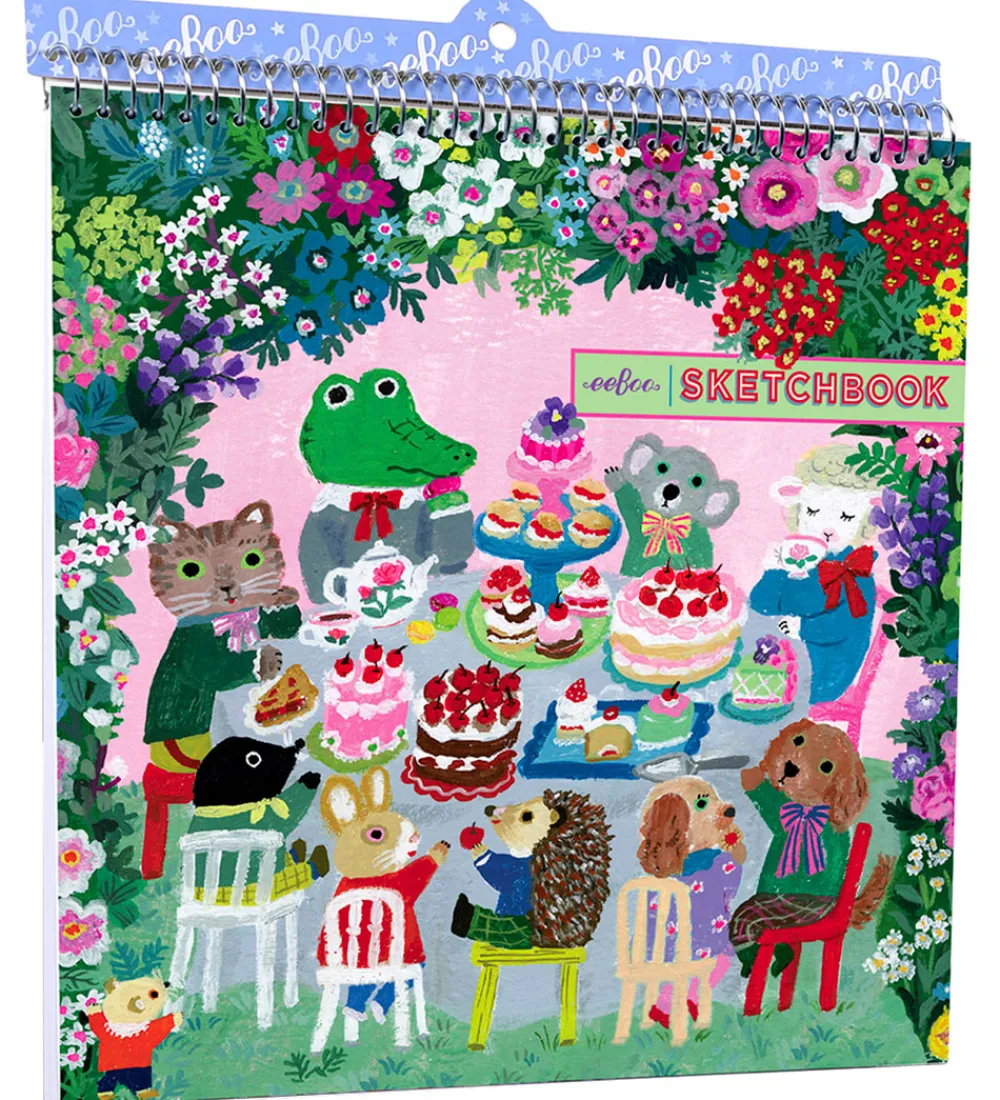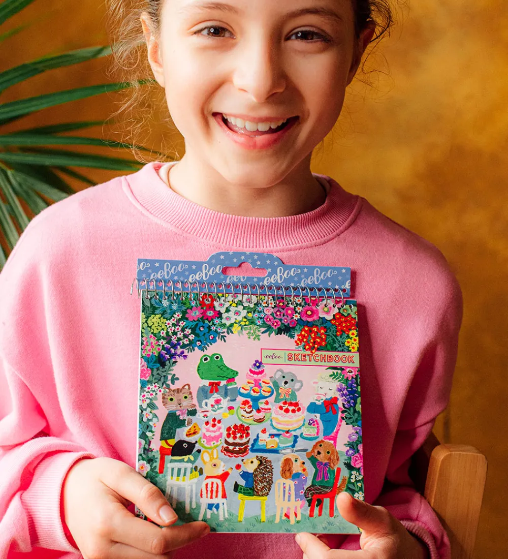 Fin Eeboo skitseblok med et forsidecover, der er smukt illustreret med dyr, som fejrer en begivenhed sammen og spiser kage.