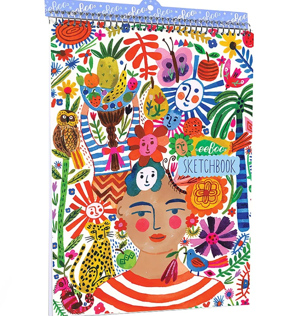 Fin Eeboo skitseblok med et forsidecover, der svimler blomster og dyr i mange farver.