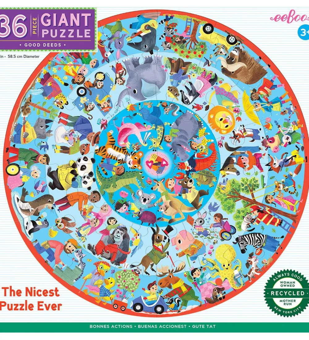 Sød Eeboo puslespil i mange farver med forskellige dyr og mennesker der gør gode gerninger for hinanden.