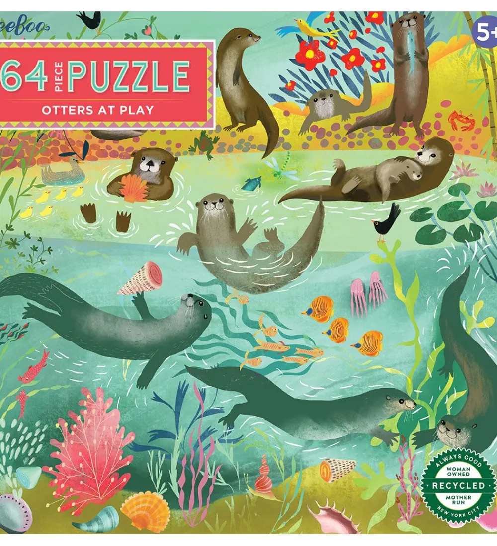 Eeboo puslespillet består af 64 brikker. Motivet er af de søde oddere, fisk, blomster og fugle.