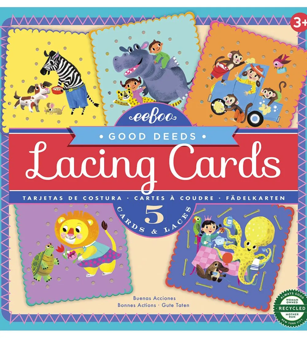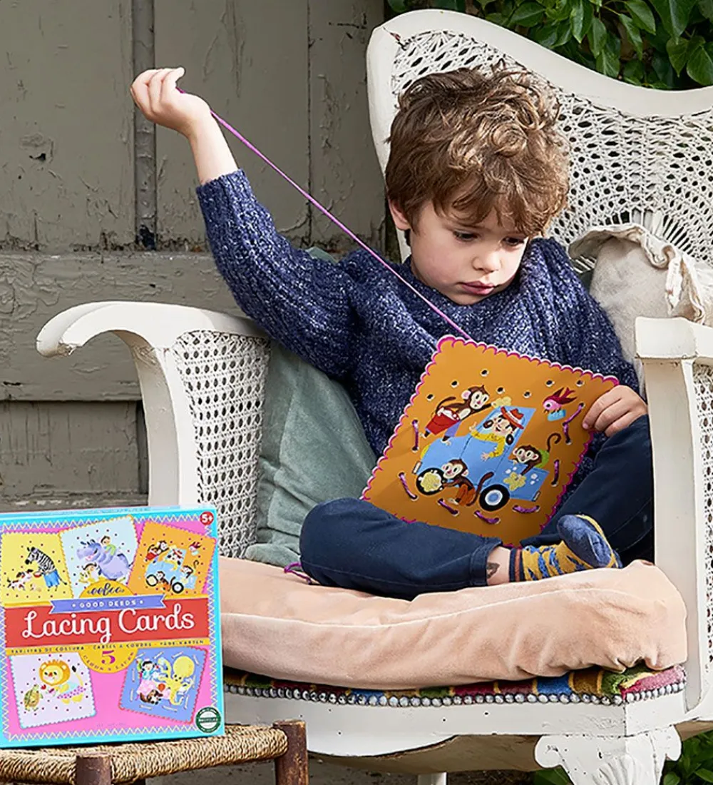 Eeboo lær at sy-kortene har huller rundt om motivet, som snorene kan føres igennem og der på den måde bliver syet en ramme omkring motivet. Barnets venstre/højre-hjerneaktivitet, tålmodighed og hånd-øjekoordination styrkes.