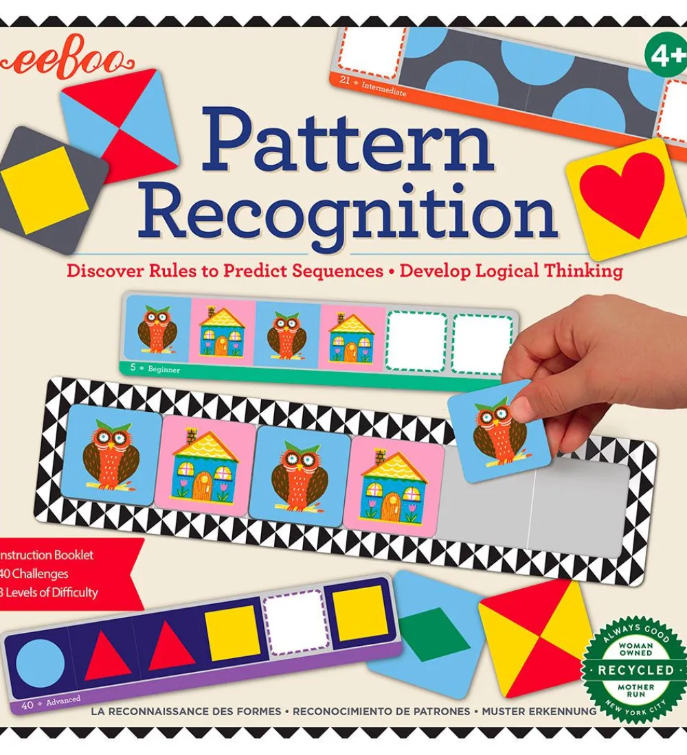 Eeboo spillet gør ud på at barnet skal bruge sin logik til, at regne ud hvad det næste led i rækkefølgen skal være. Barnet kan spille på tre forskellige niveauer alt efter hvor svært det skal være, og der medfølger i alt 40 forskellige opgaver. Når barnet har løst en opgave kan forældrene tjekke om den er rigtig ved hjælp af det medfølgende løsningshæfte.