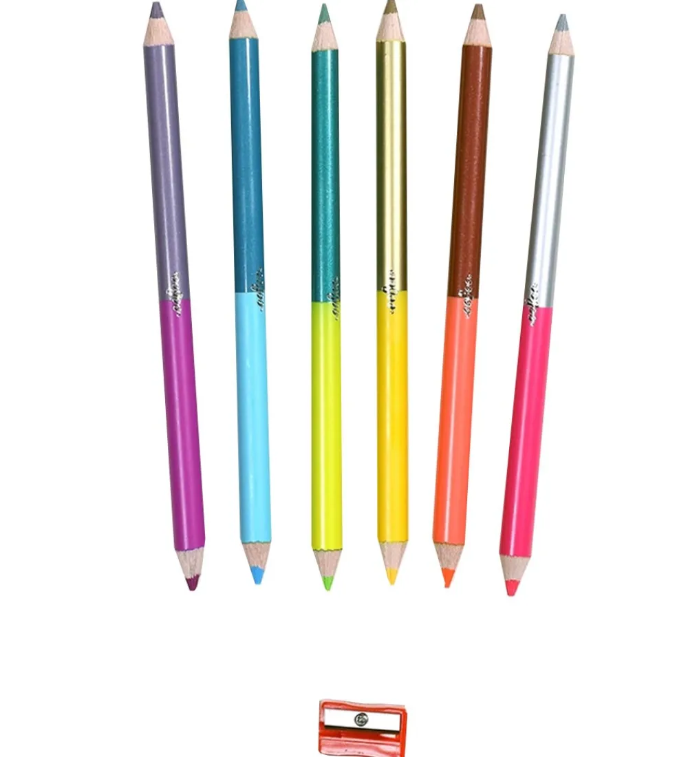 Eeboo er dobbeltsidede, så der faktisk er tolv farver, og der medfølger en smart blyantspidser.