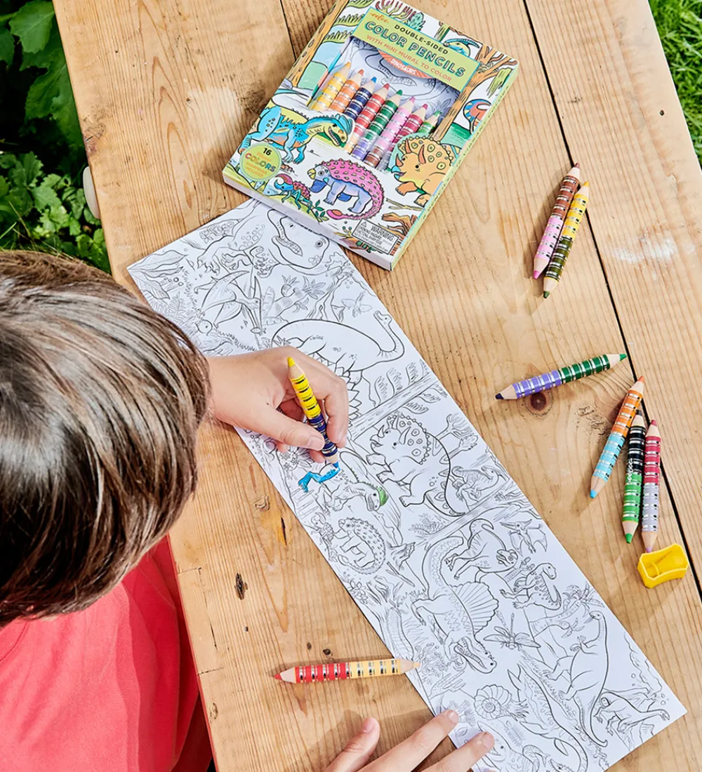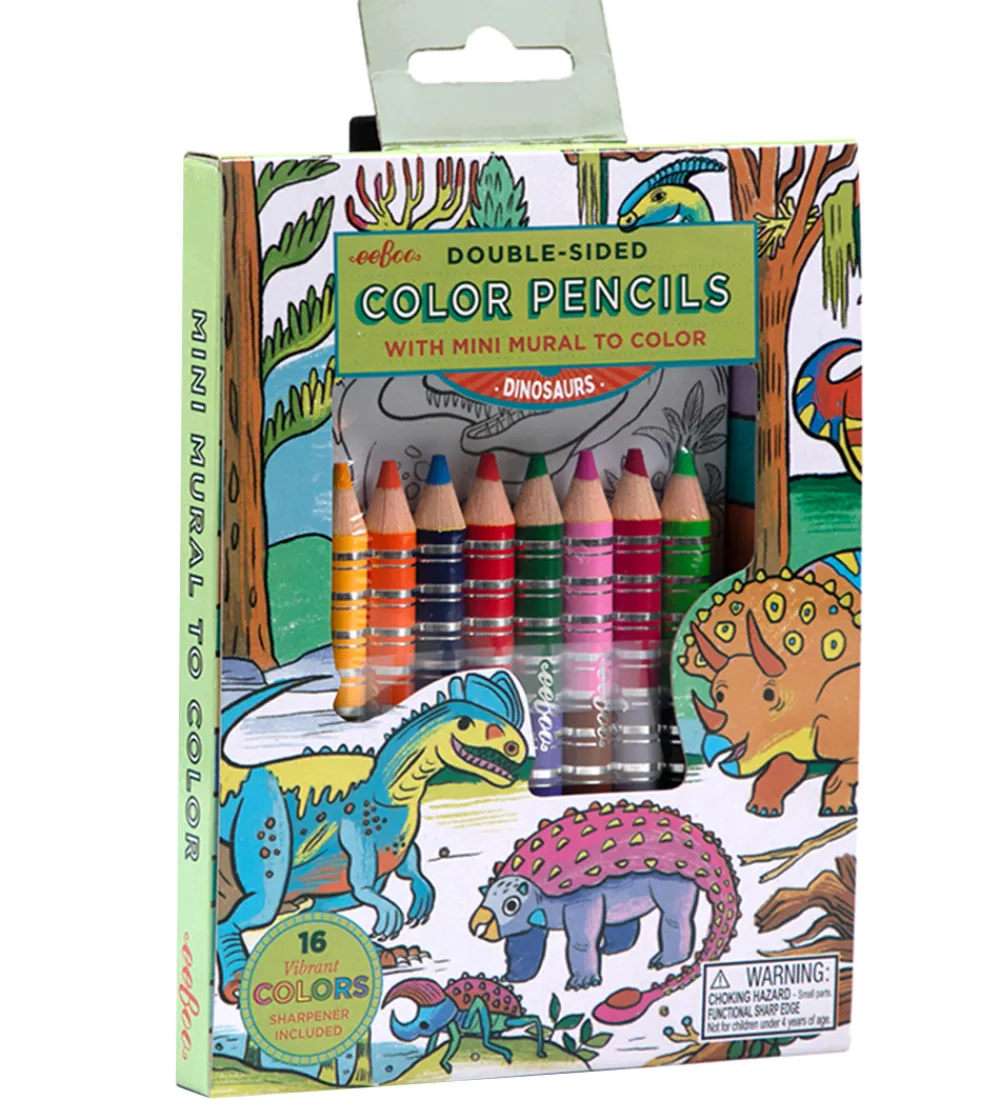Eeboo er dobbeltsidede, så der faktisk er 16 forskellige farver, og der medfølger en smart blyantspidser samt en flot tegning til at farvelægge.