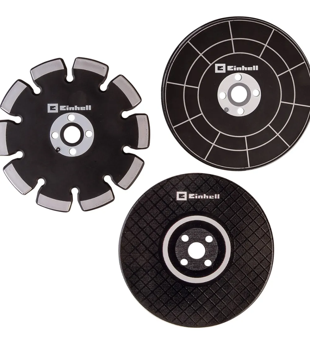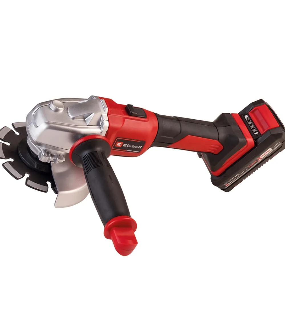 Smart Einhell vinkelsliber i rød med detaljer i grå og sort. Der medfølger tre forskellige slibeskiver og et udskifteligt batteri, som passer til alt Einhell værktøj.
