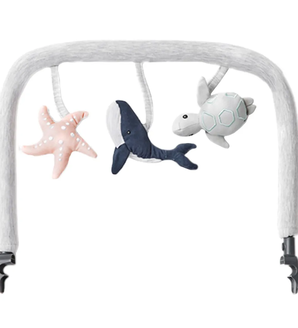 Sjovt Ergobaby aktivitetslegetøj, som passer til Ergobabys skråstol i modellen Evolve. Aktivitetslegetøjet er i et gråmeleret farvetema med tre stykke aktivitetslegetøj i form af en rosa søstjerne, en blå hval og en grå skildpadde.