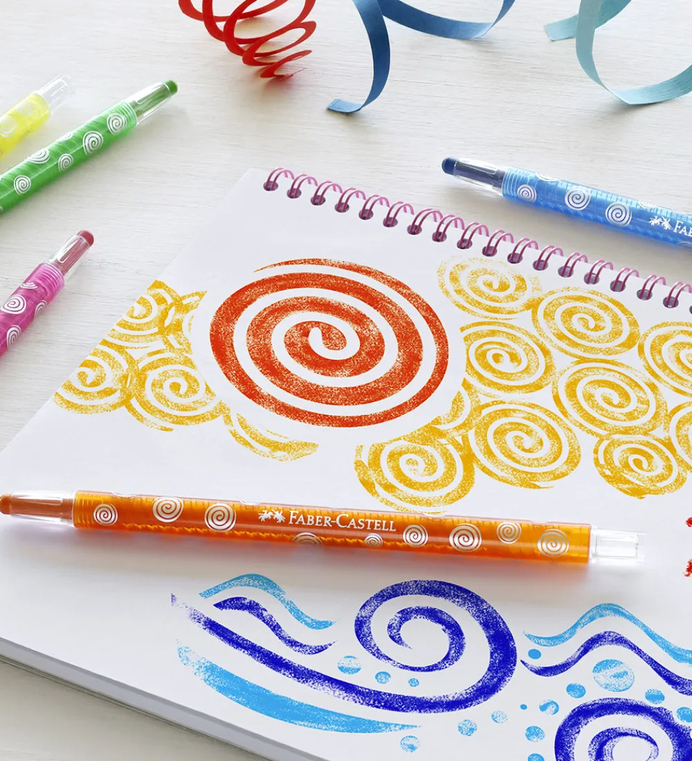 Faber-Castell farvekridtene er hver især i et plastikhylster med en drejefunktion, så farvekridtet kan drejes ud, i takt med det bruges. Børnene får dermed også mindre farve på fingrerne, og farvekridtene er beskyttede mod brud.