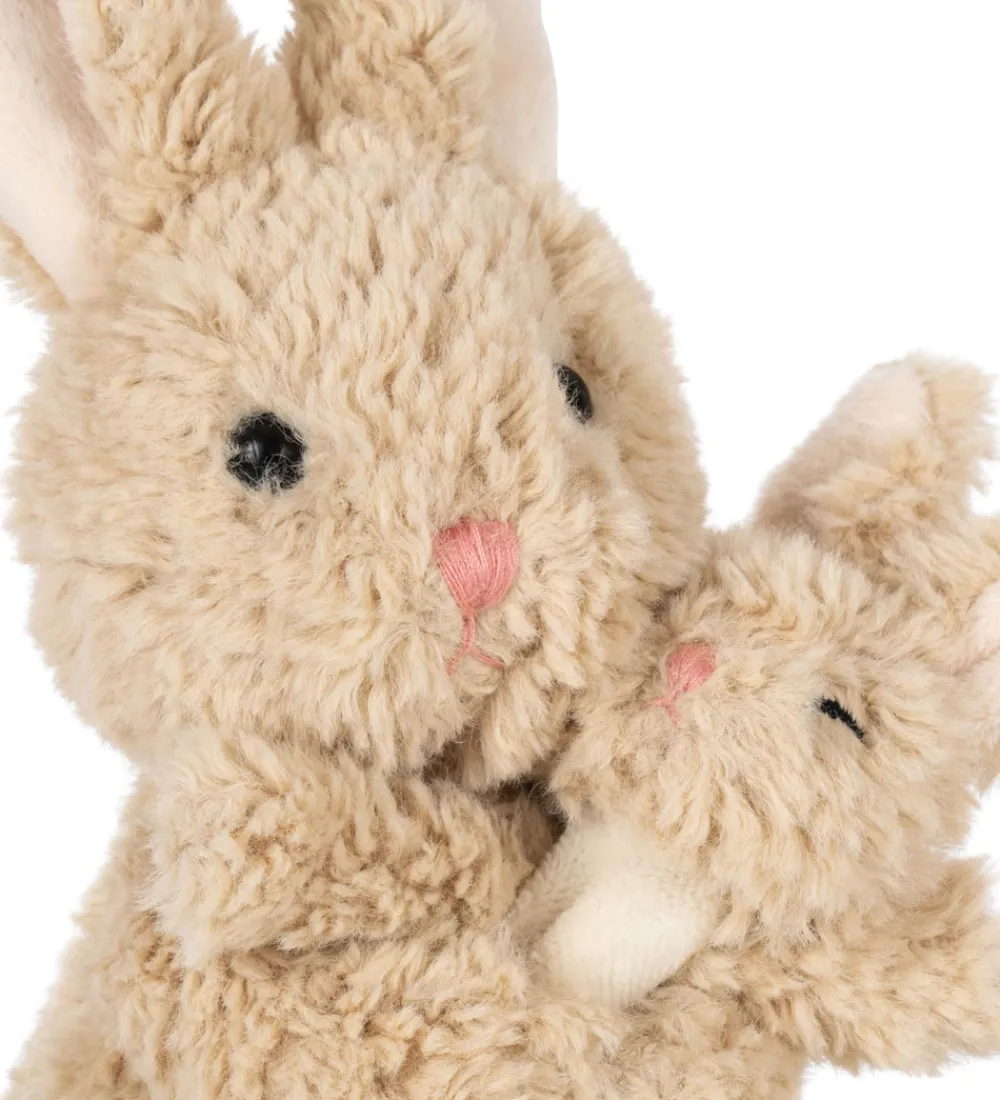 Charmerende Fanga Fontana nusseklud i cremhvidt velour med en nuttet kanin i det ene hjørne. Med nussekluden kommer en bamse som kan holde fast på nussekluden. Den hyggelige nusseklud fra Fanga Fontana er perfekt til små arme at kramme.