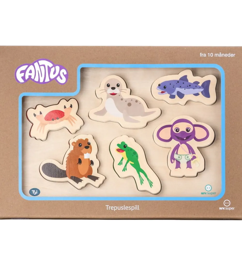 Fine Fantorangen & Fantus puslespil af træ og med 6 brikker i et “dyrene i vandet”-tema.