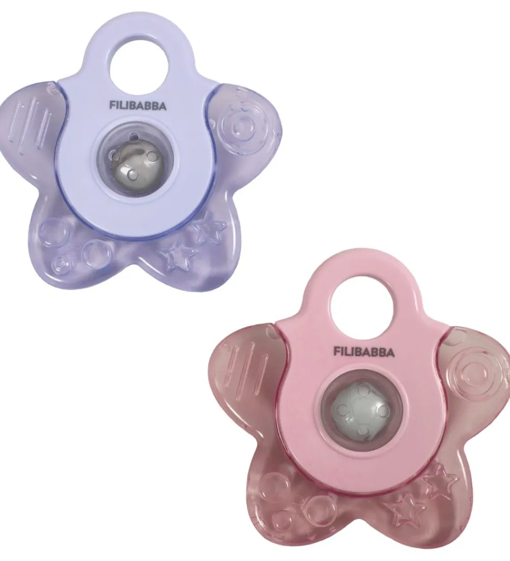 Søde Filibabba bideringe i en praktisk 2-pak, en i rosa og en i lilla.
