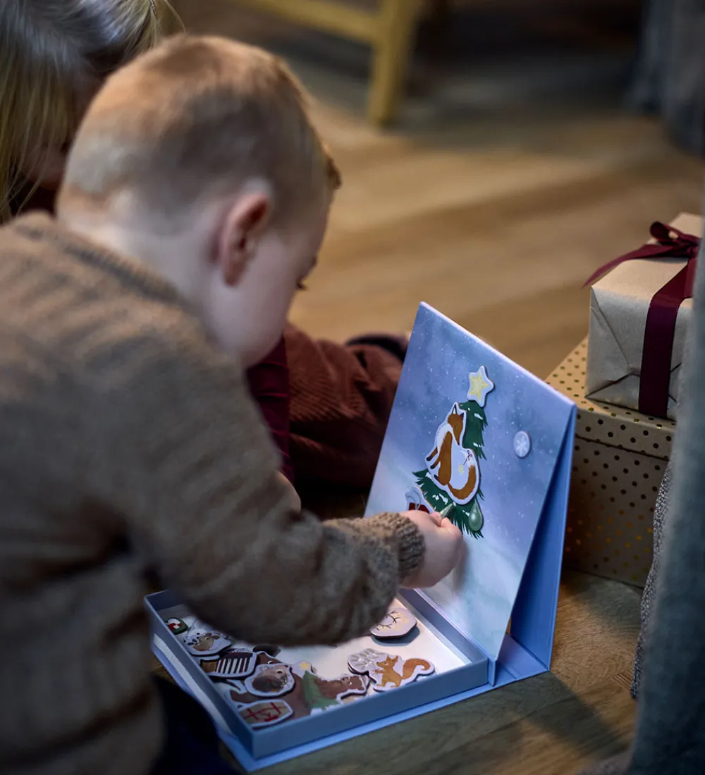 Flot Filibabba magnetlegetøj bestående af en lyseblå æske med juletema. Æsken indeholder 38 små magneter med julemotiver, som kan sættes på indersiden af æsken, og lave hyggelige billeder. Perfekt til fantasifuld leg og kreativ udfoldelse i juletiden.