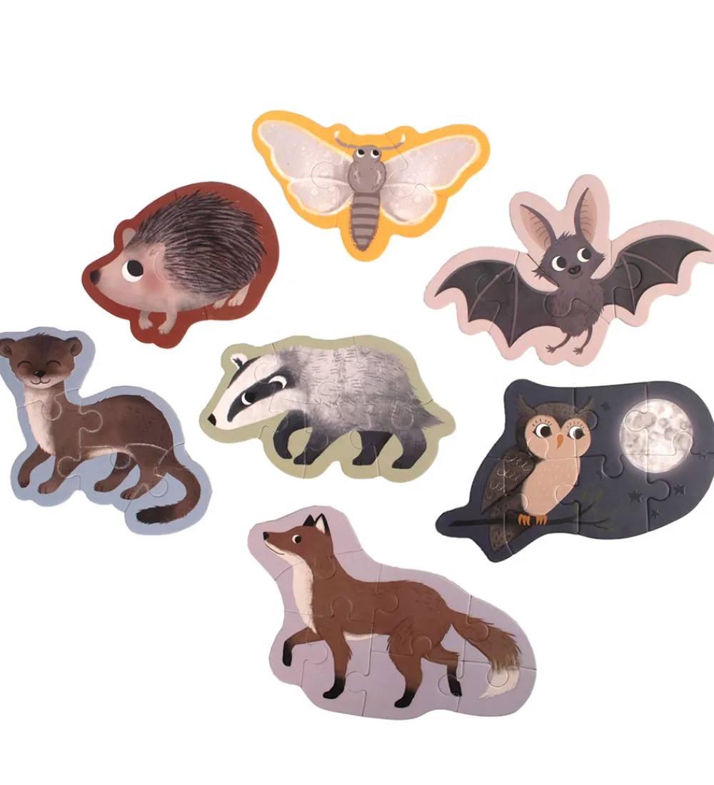 Sjovt Filibabba puslespil bestående af syv separate puslespil med motiver af skovens dyr, og motiverne kan lys i mørske.