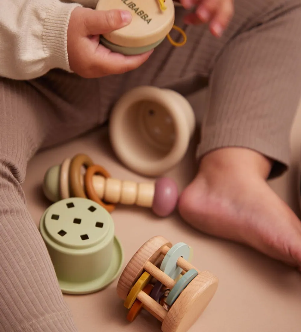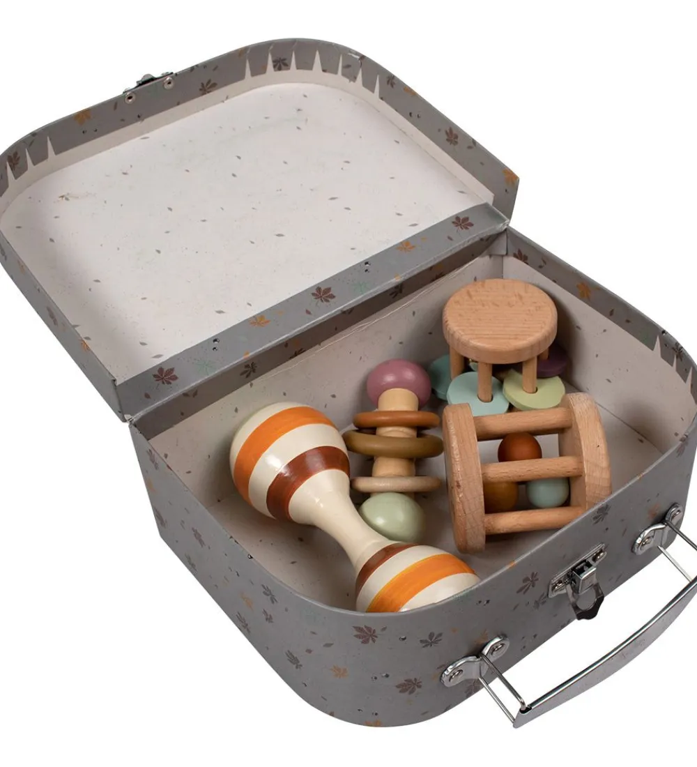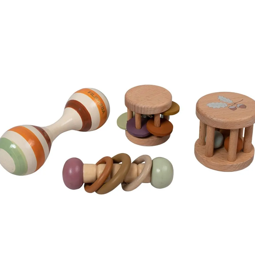 Filibabba legekufferten åbnes med et spænde og i toppen er der et praktisk håndtag. Kufferten indeholder fire stykker sanselegetøj i bøgetræ, med bl.a. klokke- og ranglelyde og masser af fine farver, der helt sikkert vil fange dit barns opmærksomhed.