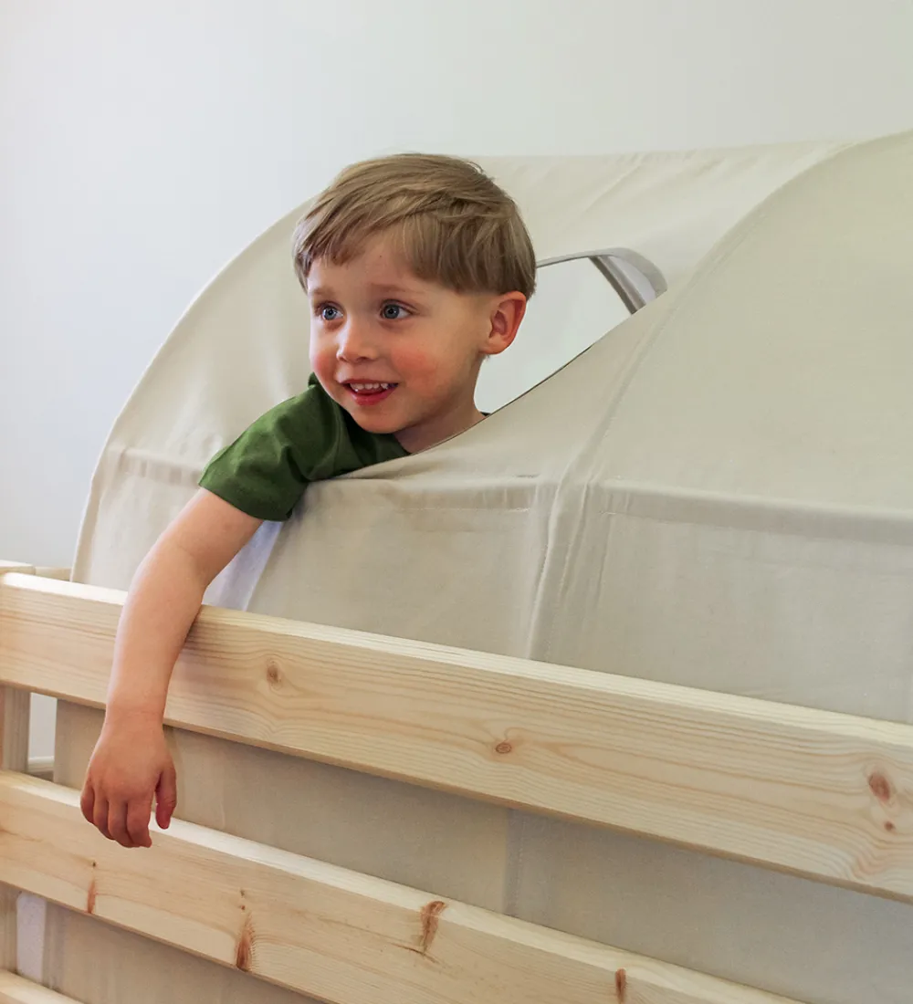 Flexa hulen er et skønt skjulested, der kan rumme både hygge, eventyr, fantasi og afslapning. Den er af stof og har et vindue i loftet, der er sjovt at kigge ud af og samtidig giver god ventilation. Hulen kan bruges for sig selv, men passer også sammen med mange af Flexas senge.