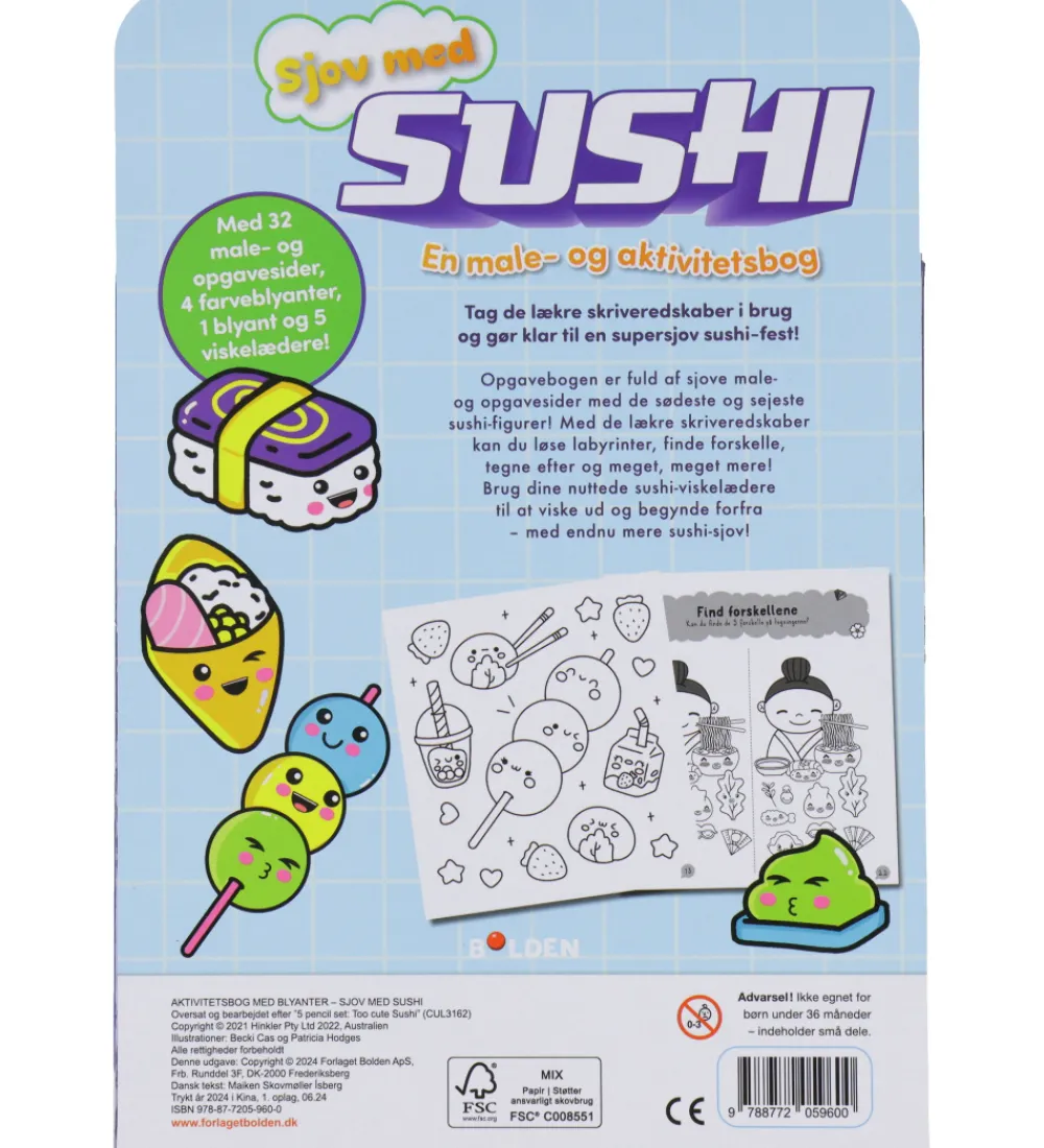 Sjov Forlaget Bolden male- og aktivitetsbog i et “Sjov med sushi”-tema samt fem, medfølgende blyanter (1 alm., 4 farve) med store viskelædere i enden.
