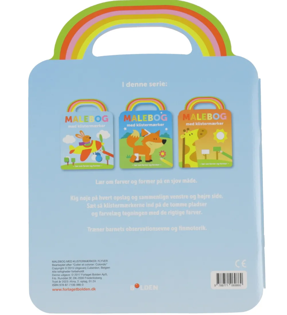 Sjov Forlaget Bolden malebog Malebog med klistermærker: Flyver. Malebogen er lavet med et regnbue-håndtag øverst.