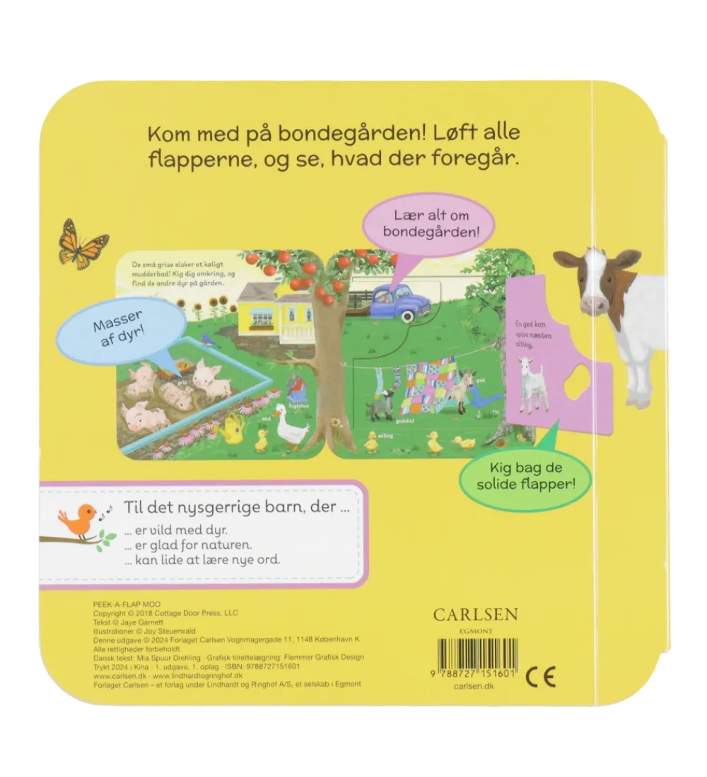 Forlaget Carlsen billedbogen er en sød lille bog med store, tykke flapper, der gemmer på mangt og meget fra bondegårdens hyggelige verden. Bogens sider er i kraftigt pap, så de tåler at blive vendt igen og igen.