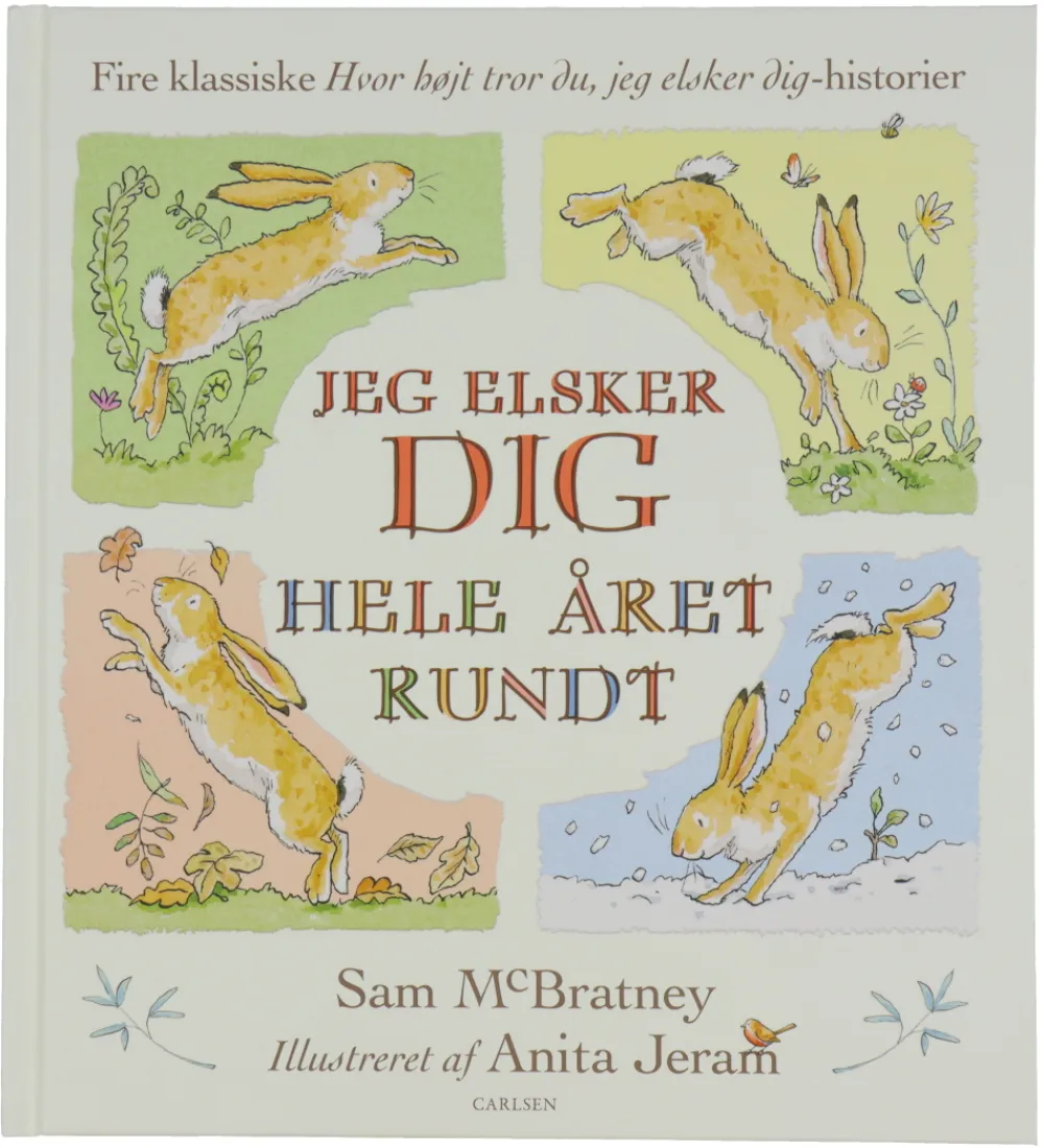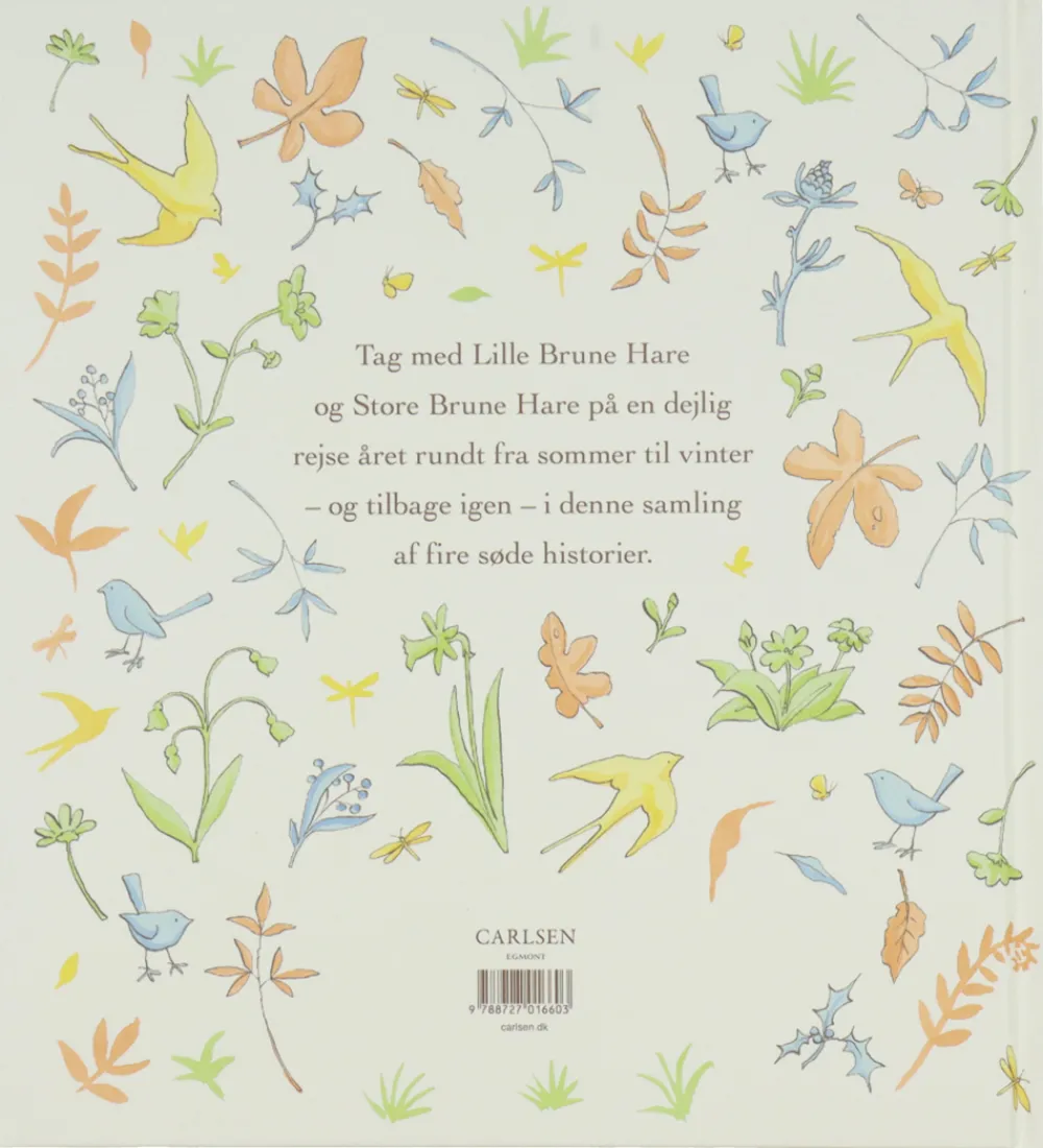 Forlaget Carlsen bogen indeholder farverige illustrationer, der engagerer de små. Bogen indeholder fire fortællinger med karaktere kendt fra godnatklassikeren “Hvor højt tror du, jeg elsker dig?”. Lille Brune Hare og Store Brune Hare tager på en rejse gennem årstiderne, hvor hver årstid har en ny historie.