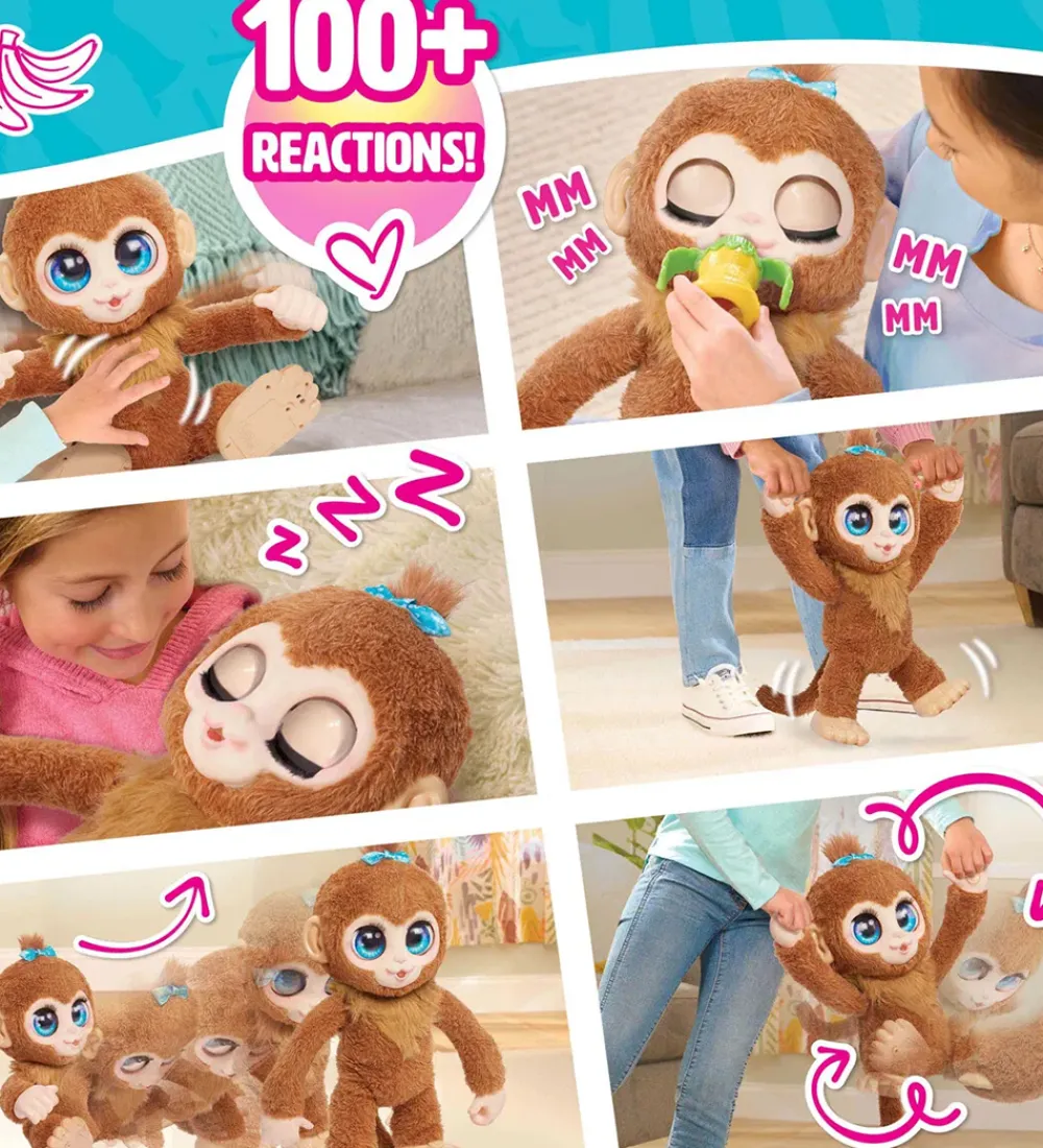 Charmerende FurReal interaktiv abe i brunt plys med store øjne og en blå sløjfe i håret. FurReal aben har mere end 100 reaktioner, og kan både rejse sig op, lave saltoer mens den hænger i armene og gå. Der medfølger en sutteflaske som ligner en banan. Deruover kan aben spise, grine, sove og meget mere. Aben er super blød og bliver hurtigt en god og sjov ven.