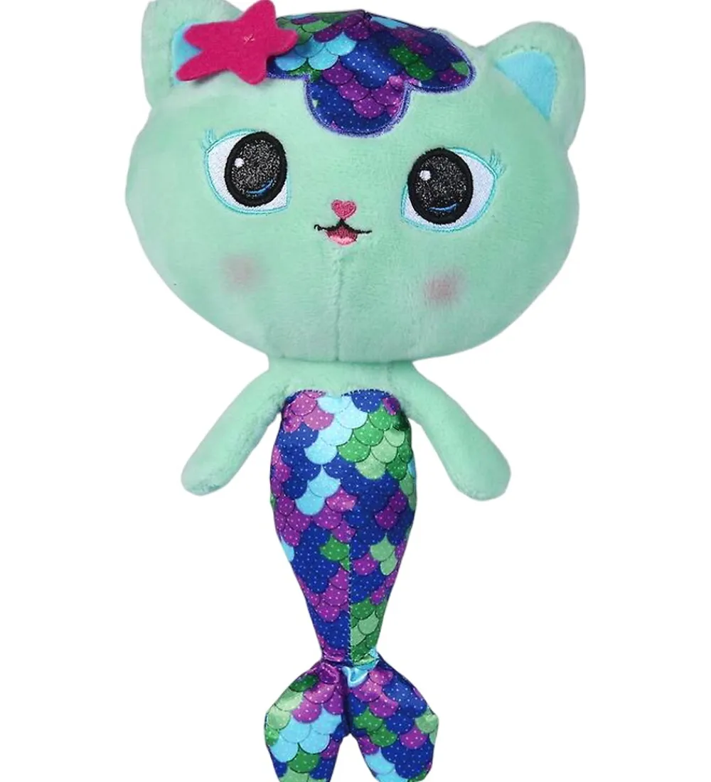 Sød Gabby’s Dollhouse bamse i form af Mercat i turkis med havfruedragt og en blomst ved det ene øre. Bamsen har et smilende ansigt og er super blød at lege med.