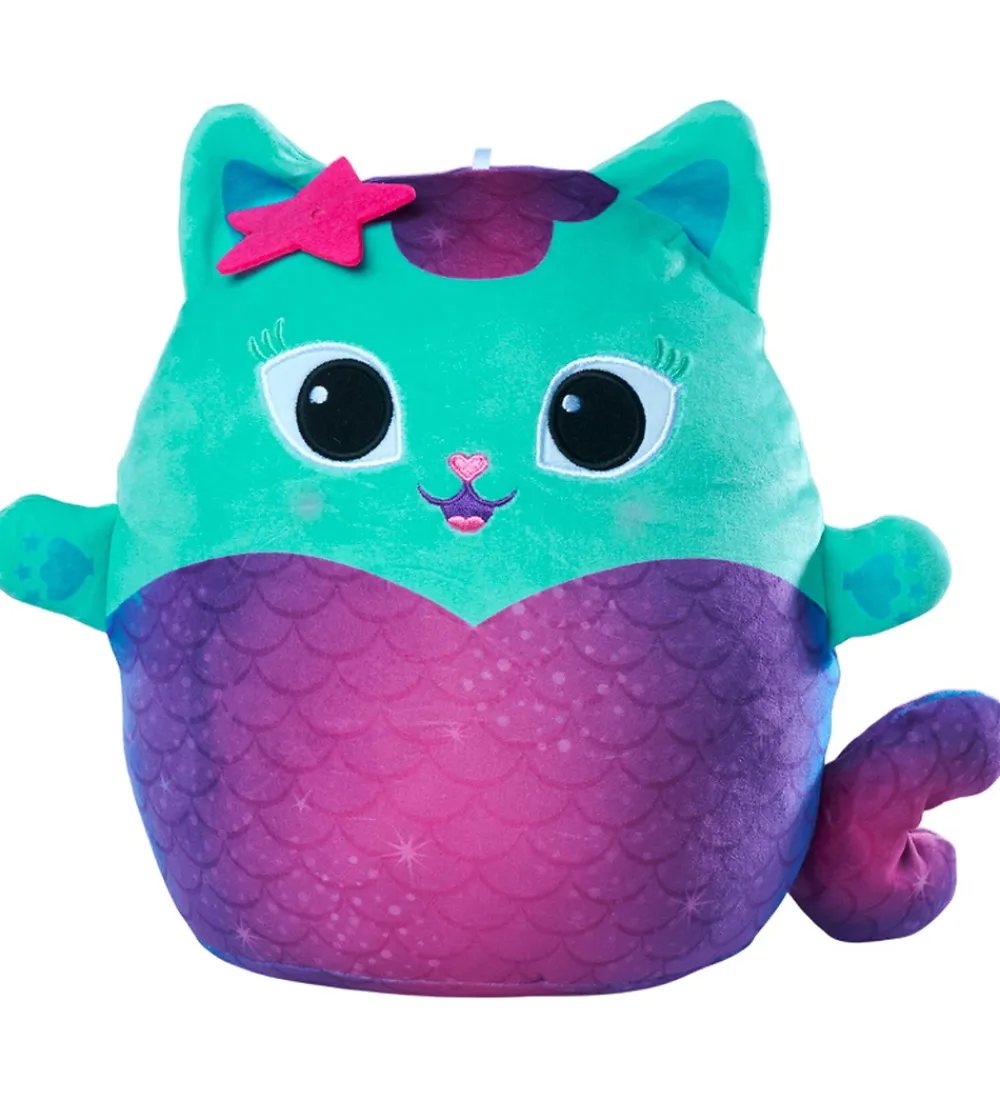 Farverig Gabby’s Dollhouse bamse i form af karakteren Mercat i turkis og lilla med havfrueprint og en stjerne ved det ene øre. Bamsen har en rund facon med ører, små arme og små ben. Den har et sødt ansigt, og er super blød at kramme.