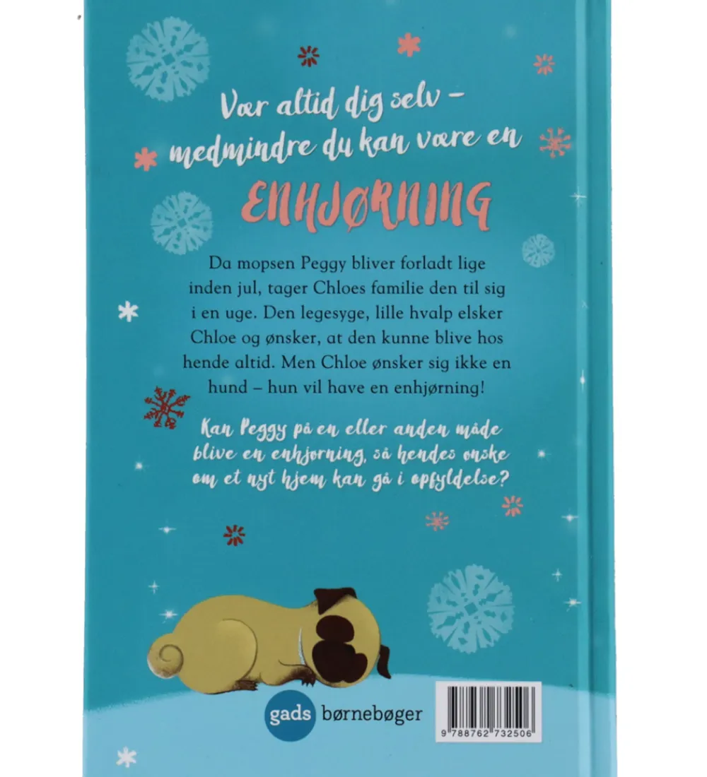 Gads Forlag bogen handler om hunden Peggy, som bliver forladt af sin familie lige inden jul. Heldigvis tager Chloe og hendes familie sig af den lille mops, men Chloe vil faktisk hellere have en enhjørning. Så kan Peggy forvandles til en enhjørning og blive boende hos den lille familie?
