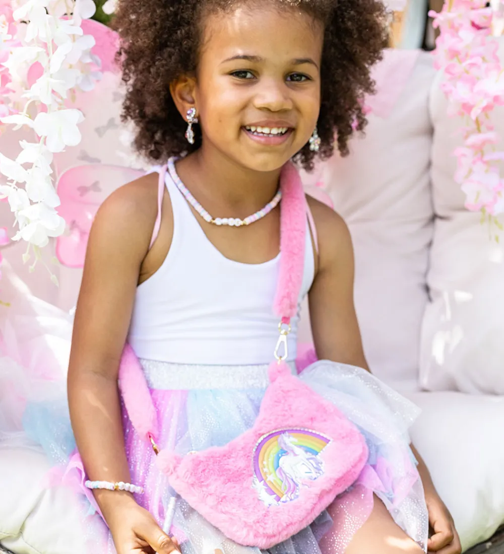 Farverig Great Pretenders skuldertaske med et sødt enhjørning- og regnbueprint på fronten. Tasken er i en pink nuance og har en blød overflade af imiteret pels, samt en praktisk skulderrem.