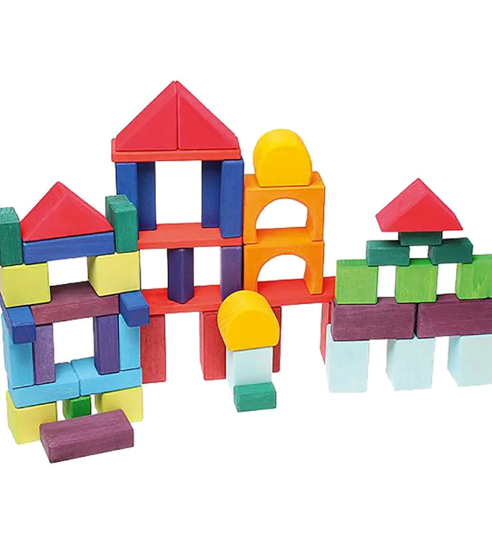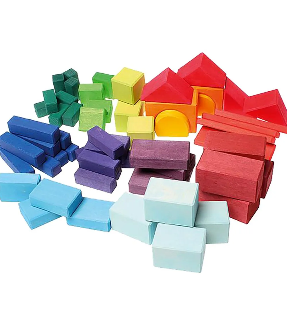 Sjovt Grimms trælegetøj bestående af 60 klodser i regnbuens farver.