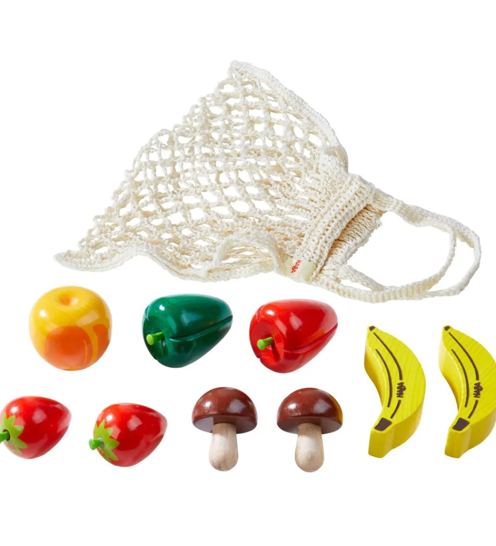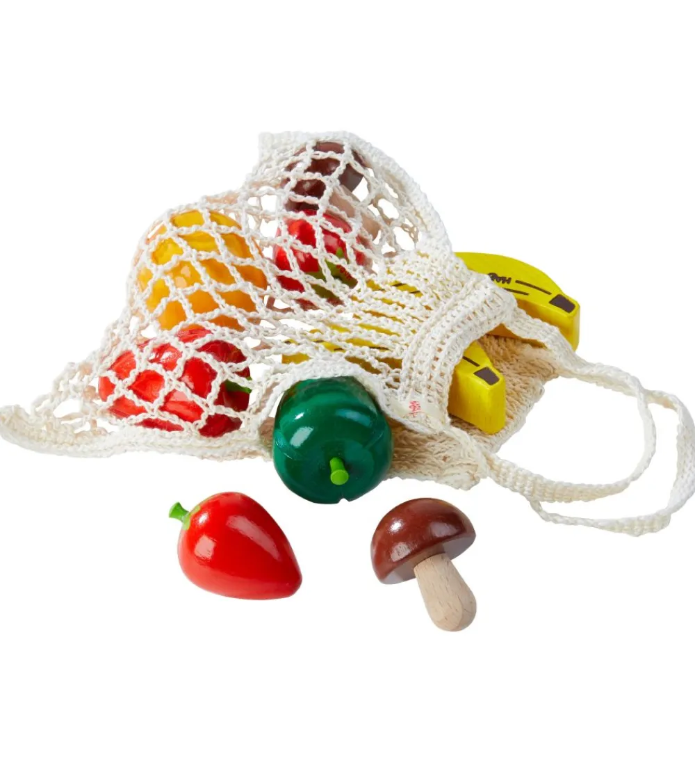 Haba legemaden er en skøn tilføjelse til legekøkkenet eller til andet rolleleg. Nettet har et praktisk håndtag i toppen, så det er let at tage med sig.