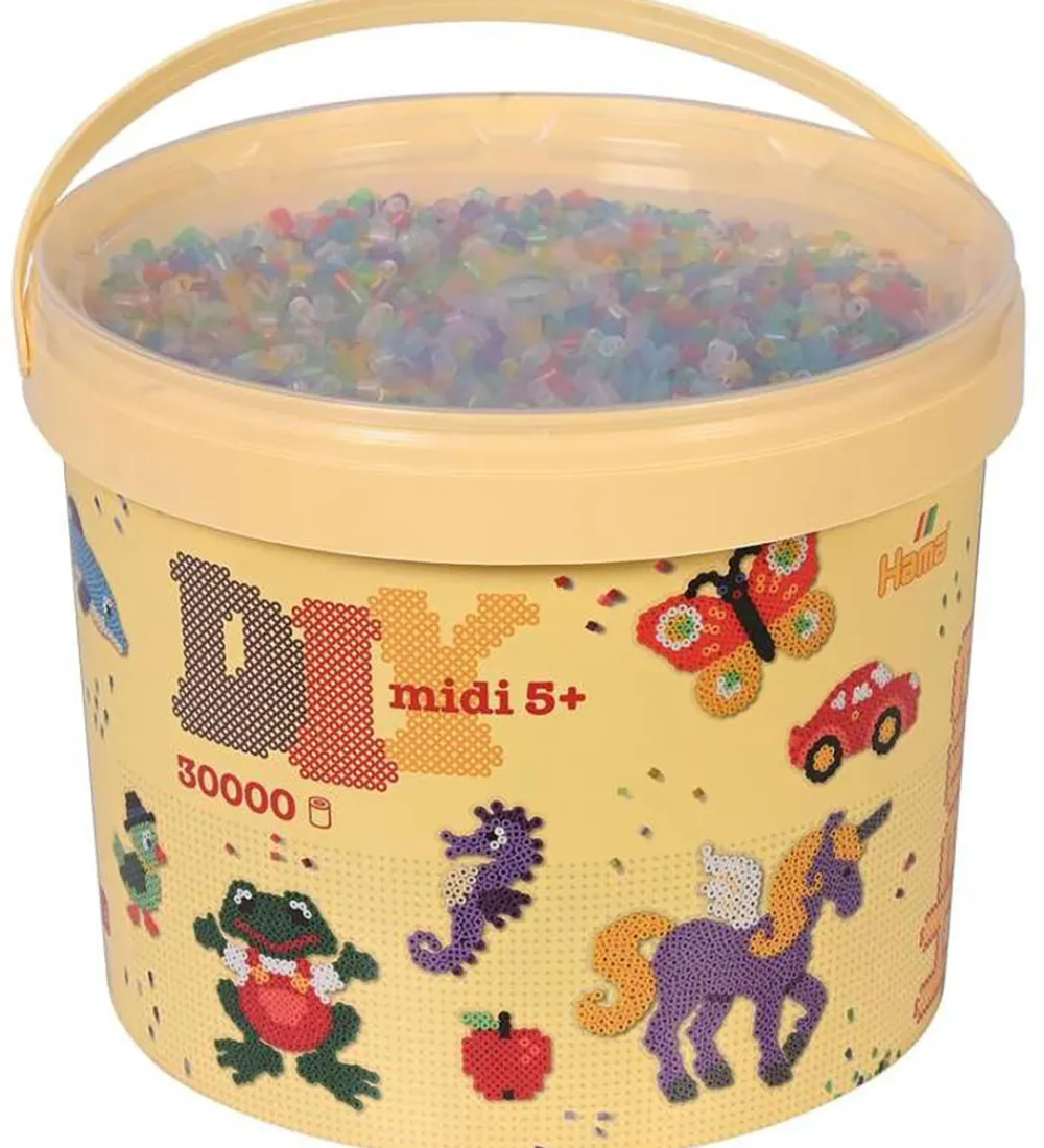 Hama perlerne kommer i en stor bøtte med et transparent låg, der indeholder 30.000 Midi perler.