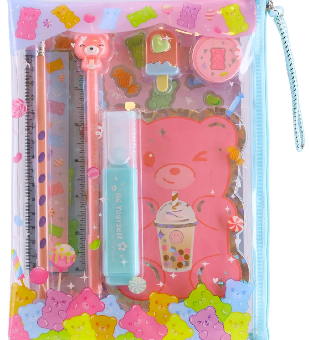 Farverig Hot Focus taske med et skolesæt der inkluderer, en notesblok, en lineal (15 cm), en kuglepen, en blyant, et viskelæder, en blyantspidser, et ark med klistermærker og en highlighter. Perfekt organiseret i en praktisk klar taske.