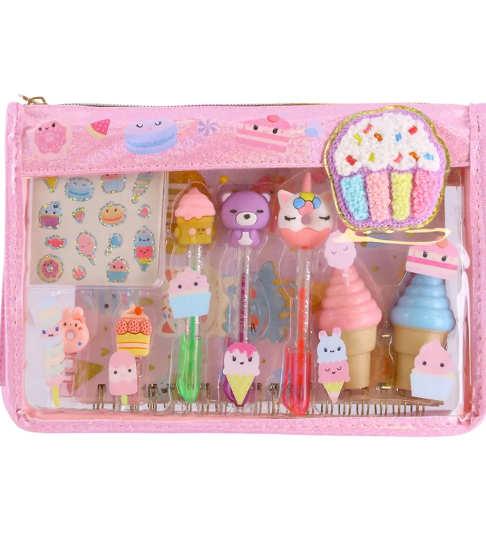 Charmerende Hot Focus taske med forskelligt tilbehør der inkluderer, tre gel-kuglepenne, to highligthers formet som en isvaffel, to klips, et ark med klistermærker og en notesblok med spiralryg. Perfekt organiseret i en praktisk klar taske.