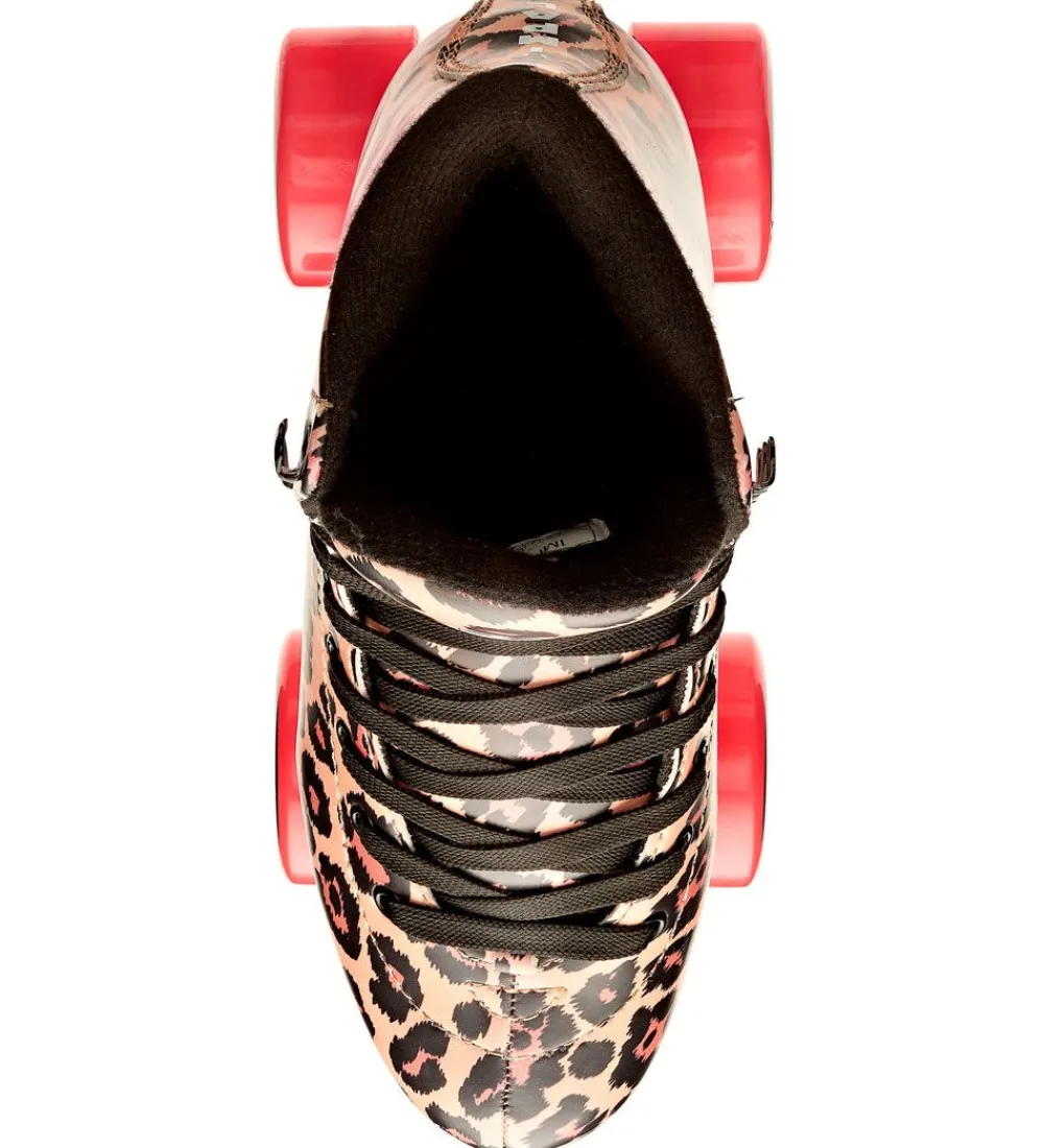 Smarte Impala rulleskøjter med et leopardmønster i brune og sorte nuancer, med sorte snørebånd. Rulleskøjterne har røde hjul med en sort yderside.