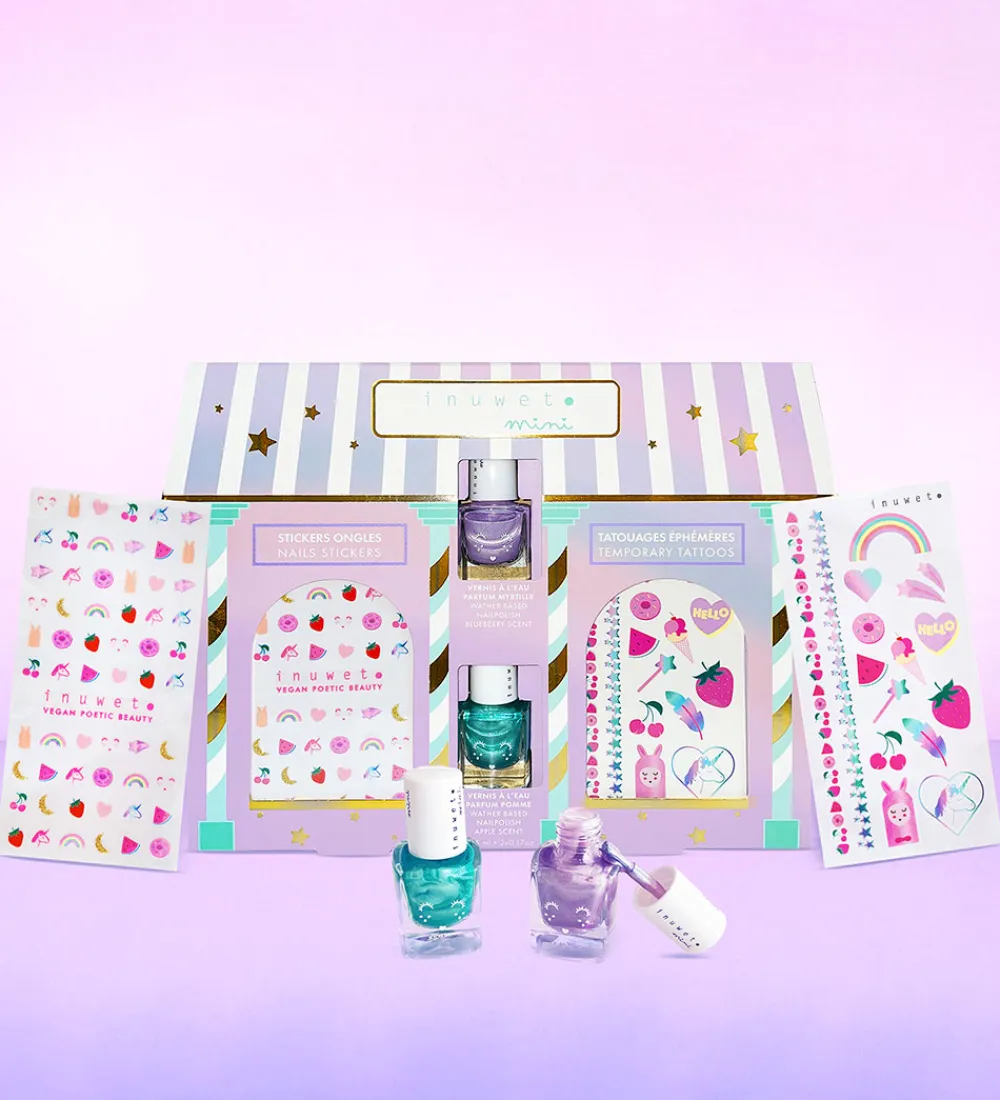 Skønt Inuwet gavesæt, som består af to neglelakker i metallisk lilla og turkis samt negleklistermærker og tatoveringer.