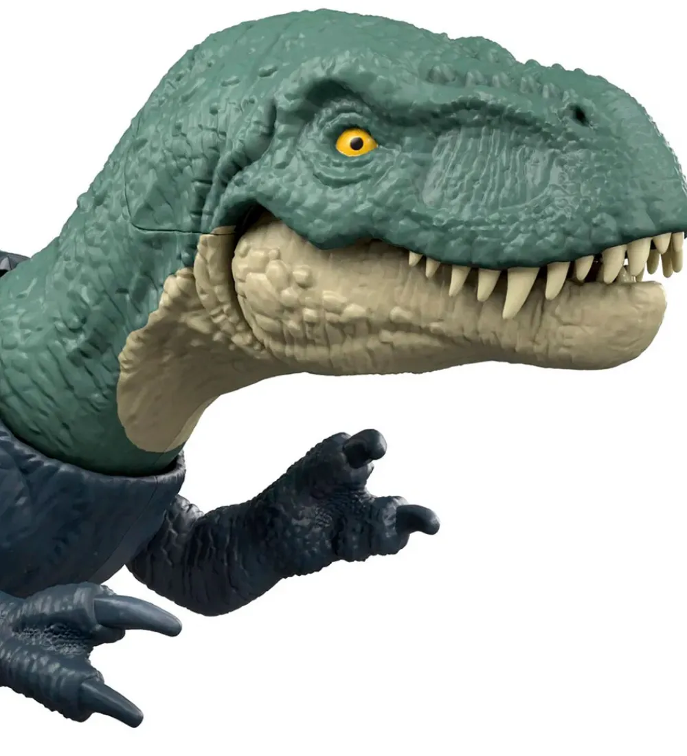 Flot Jurassic World-dinosaur, der forestiller en nanotyrannus i mørkeblå og grøn. Den har bevægelige arme og ben, og når man skubber halen til siden, drejer den også hovedet til siden, samtidig med at den åbner munden.