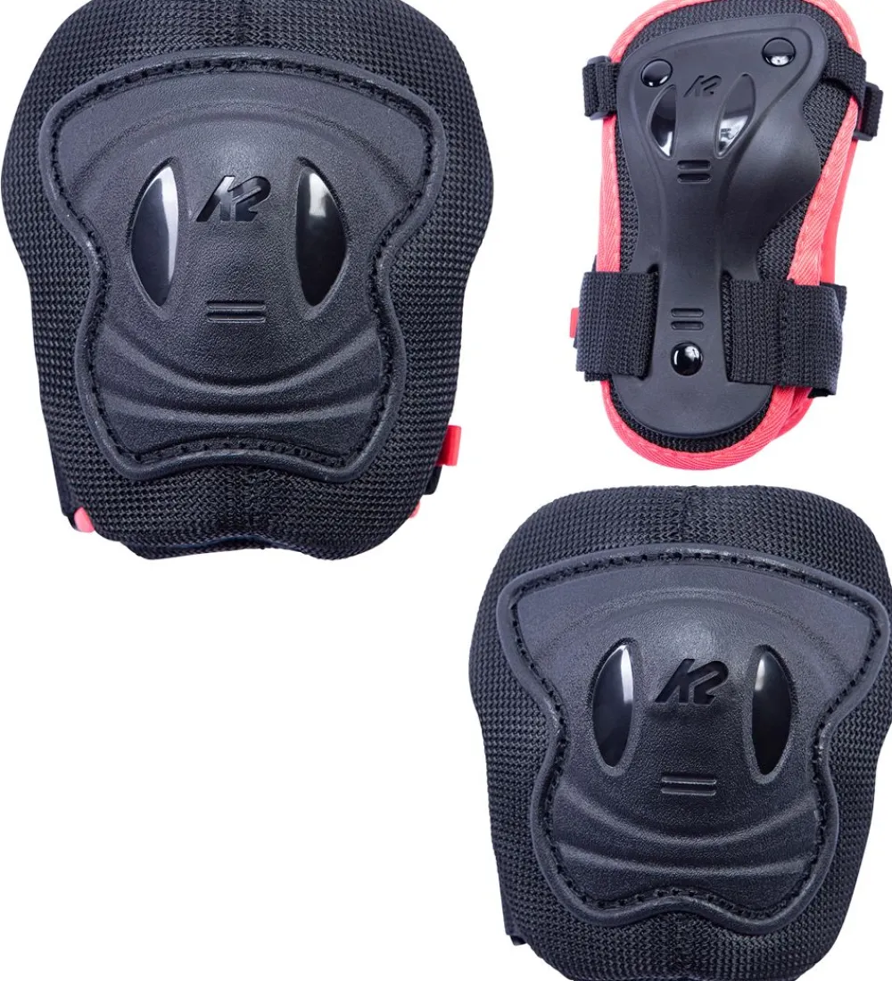 Smart K2 beskyttelsessæt i sort med rosa detaljer bestående af knæ, albue og håndledsbeskyttere.