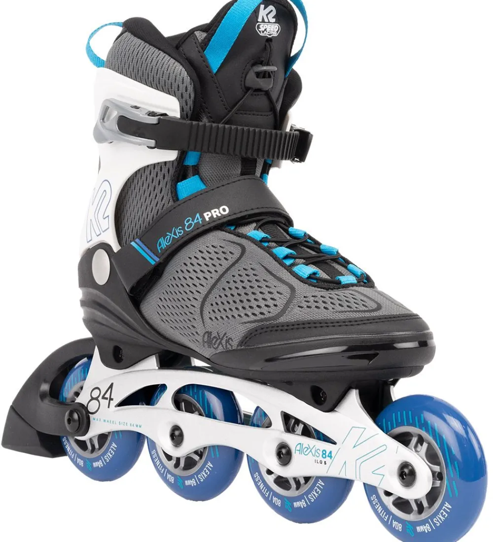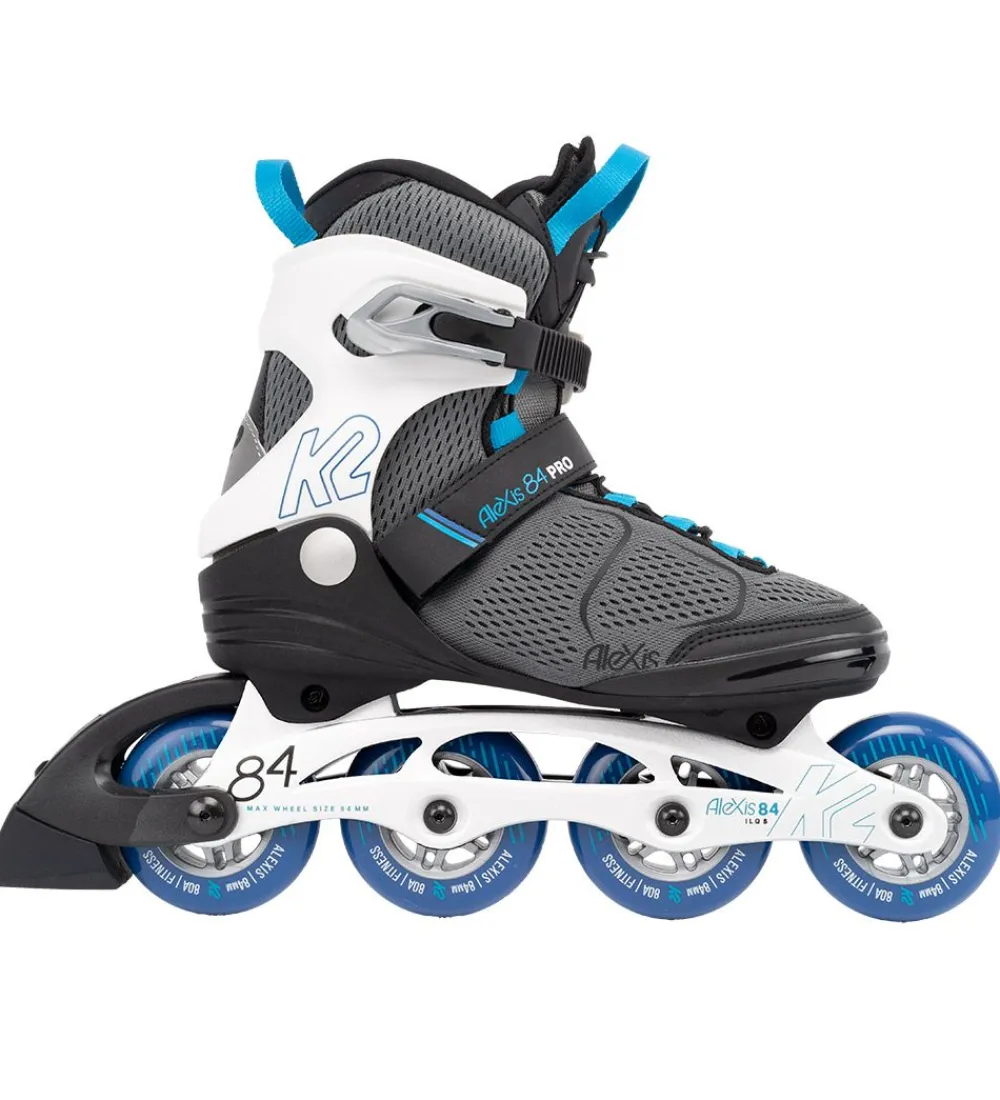 Fede K2 rulleskøjter i grå mesh med blå og hvide detaljer.