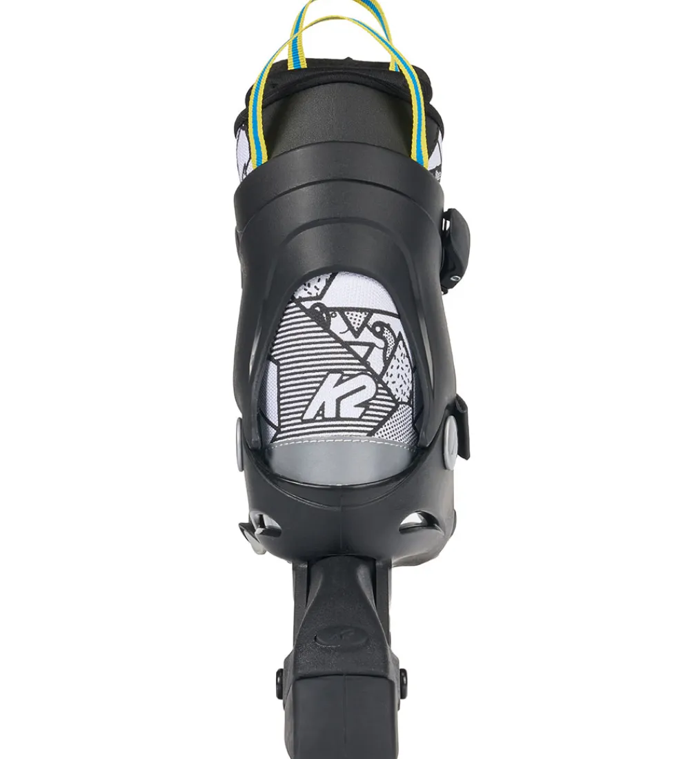 Flotte K2 rulleskøjter i hvid og sort, med gule, grønne, oange og blå hjul. Rullerskøjterne har et flot mønster som man selv kan farvelægge med de 5 medfølgende tusser.