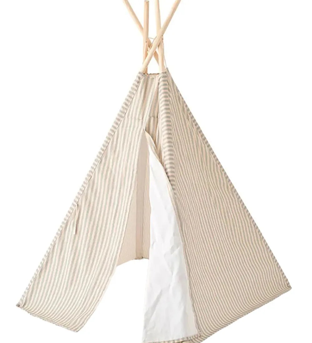 Sødt Kids Concept legetelt med striber i cremehvid og lyseblå.